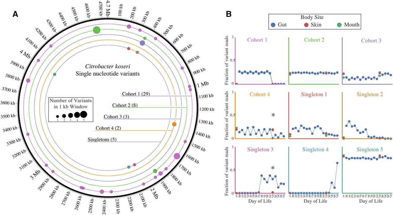 Subpopulations exist within colonizing C. koseri populations. (A) Single nucleotide variants were identified by mapping reads from all Infant 1 samples to the draft genome of C. koseri recovered from Infant 1. The total number of variants in each cohort is listed in parentheses. (B) The frequency of each variant in each sample. Cohorts are plotted as the average of all variant frequencies, with error bars representing standard deviation of the mean. Asterisks represent cases where the frequency of variants is statistically different between body sites (Fisher's exact t-test with Bonferroni correction, P < 0.01).