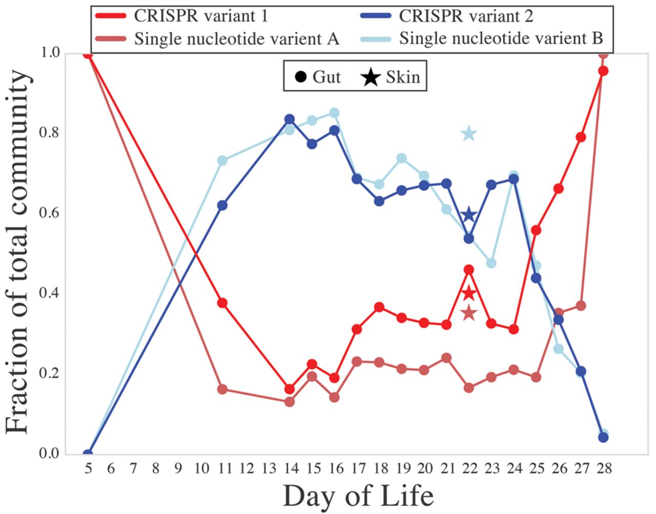 E. faecalis CRISPR variants change frequency within the E. faecalis population over the colonization period for Infant 2. The relative abundances of each CRISPR variant (diagrammed in Fig. 6) are shown. Additionally, two single nucleotide variants within E. faecalis correlated significantly with CRISPR variant frequencies (Pearson correlation with Bonferroni correction, P < 0.01). Both variants are located in the coding regions of hypothetical proteins.