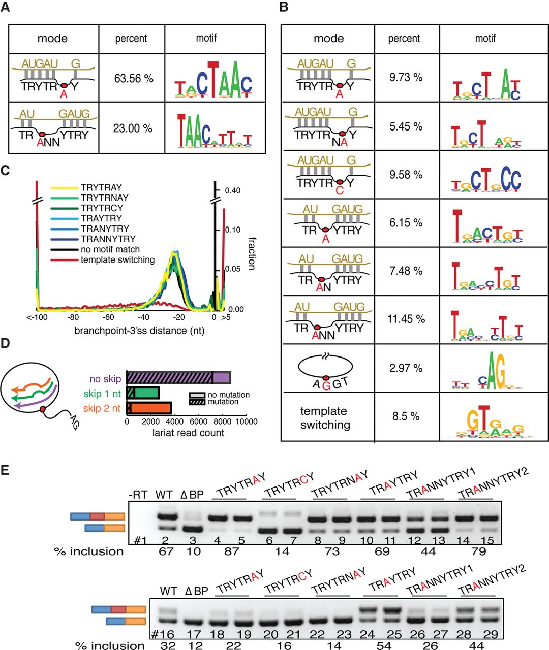 Alternate modes of U2snRNA:pre-mRNA base-pairing emerged from lariat mapping. (A) U2snRNA:pre-mRNA base-pairing models found in Schizosaccharomyces pombe. Twenty-nucleotide windows around unprocessed branchpoint reads were iteratively aligned to U2snRNA in a manner that allowed branchpoint location, loop location, and the loop length to vary. Significantly enriched modes of base-pairing were identified and recorded. Left column: schematics of significantly enriched modes of base-pairing, middle column: percent of lariat reads that fit model, right column: motif of lariat reads that fit model. (B) U2snRNA:pre-mRNA base-pairing models found in human. Left column: schematics of significantly enriched modes of base-pairing, middle column: percent of lariat reads that fit model, right column: motif of lariat reads that fit model. (C) Branch site motif distribution relative to the 3′ss. (D) The skipping behavior and mutational profile of reverse transcriptase (RT) was inferred from the human canonical branchpoint (TRYTRAY) mapping. The histogram describes the frequency of each size of RT-induced skip (x-axis). The striped portion of bars represents the fraction of misincorporation events at the apparent branchpoint. (E) Exemplars of branch site motifs were validated in a strong (APRT, upper) and weak (SHMT2, lower) branch site reporter minigene. Branch sites of the first intron (between the blue and red exons) were first deleted (ΔBP, lanes 3,17) or replaced by branch site motifs identified in B to test for their ability to restore splicing. Inclusion level of the middle exon is indicated under the gel image.