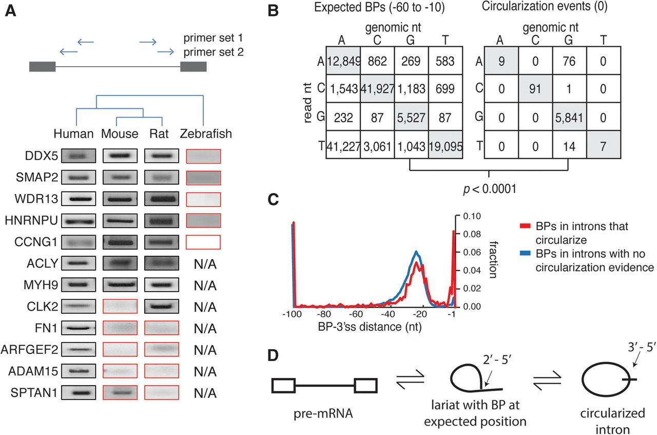 Intron circularization via 3′-5′ linkage is conserved and arises in introns that also contain branchpoints in the expected region. (A) Conservation of the intron circles was assessed by inverted nested RT-PCR in multiple species (primer location indicated by arrows) and Sanger sequencing. The PCR results inconsistent with conserved distal branchpoints are boxed in red. ‘N/A’ indicates certain introns were not tested. (B) Mutational profile of branchpoints from expected region (left) compared with mutational profile from full intron circularization events (right). (C) Location of additional branchpoints in introns which circularize (red) was compared to introns with no observed evidence for circularization (blue). (D) Model for circles implicates a 3′-5′ circular linkage arising from a conventional lariat.