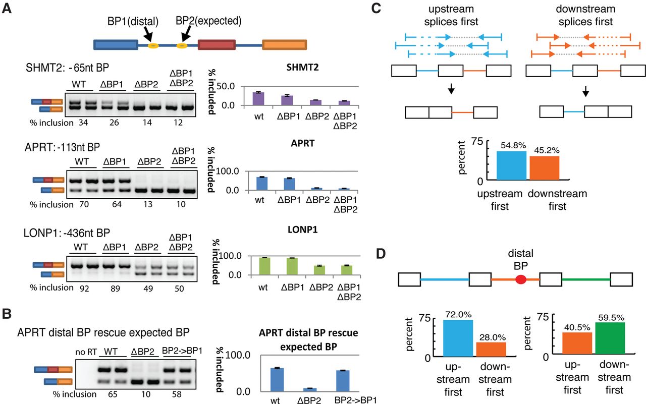 Distal branchpoints are functional elements that are associated with delayed splicing. (A) Both or either one of the distal (BP1) and expected (BP2) branchpoints was mutated in a splicing minigene as depicted at the top. Minigenes were transfected into HEK293T cells and inclusion of the middle exon was measured by RT-PCR as a readout of branchpoint activity (two replicates displayed for each construct). The splicing inclusion level was estimated by ImageQuant software across ≥3 replicates and recorded below each panel and in the histogram to the right. (B) Expected branch site of APRT (i.e., BP2) was replaced by the sequence of the distal branch site (BP2→BP1) and the functionality of branch sites was assayed by RT-PCR as in A. (C) Scheme for determining relative order of intron removal from paired-end reads, using all human introns. The bar plot indicates the degree to which the upstream (blue) and downstream (orange) introns splice first. (D) Introns that contain distal branch sites (orange) were analyzed for order of intron removal. “Upstream first” contains loci where the upstream intron reliably spliced first (i.e., >90%) and “downstream first” contains loci where the distal intron spliced before the upstream intron (left). Similar comparisons were performed on the downstream intron (right).