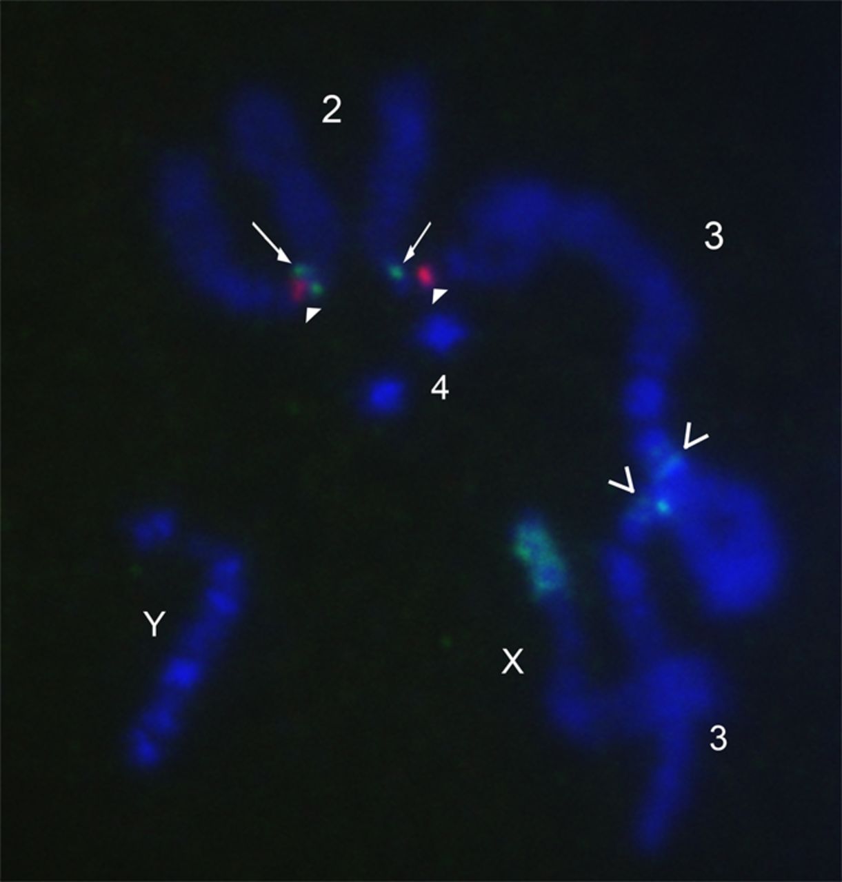 FISH image of D. melanogaster mitotic chromosomes showing Rsp and 1.688 satellites. DNA is stained with DAPI (blue). Rsp is in red (closed arrowheads) and 1.688 family satellites are in green. The 260-bp array is located on Chromosome 2L (arrows), and 353/356-bp arrays are located on Chromosome 3L (open arrowheads).