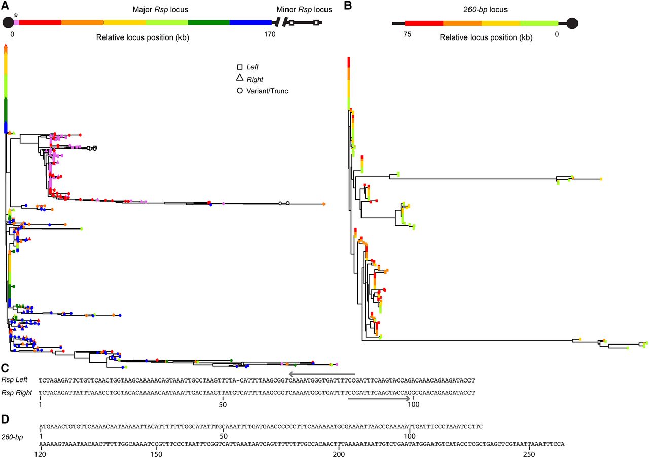 Neighbor-joining tree of complex satDNA monomers. (A) Rsp repeats in the Chromosome 2R locus. Repeats were divided into bins each of which contains one-sixth of the locus, or about 180 repeats/bin. Tip color corresponds to position in the array (red is most centromere-proximal; blue is most distal). The tip symbol indicates if the repeat is Rsp Left (square), Rsp Right (triangle), or variant/truncated (circle). (*) Repeats corresponding to the G2 contig suspected of being centromere-proximal are indicated in pink. Note that these repeats cluster with the repeats on the proximal end of the Rsp contig (red), although it is possible that these are actually distal to the locus. (B) 260-bp repeats in the Chromosome 2L locus. Repeats were divided into bins each of which contains one-fourth of the locus, or about 57 repeats/bin. Tip color corresponds to position in the array (green is most centromere proximal; red is most centromere distal). (C) Aligned consensus Rsp Left and Rsp Right repeat sequences with PCR primers (arrows) used to amplify across Left/Right Rsp dimers. (D) Consensus 260-bp repeat sequence.