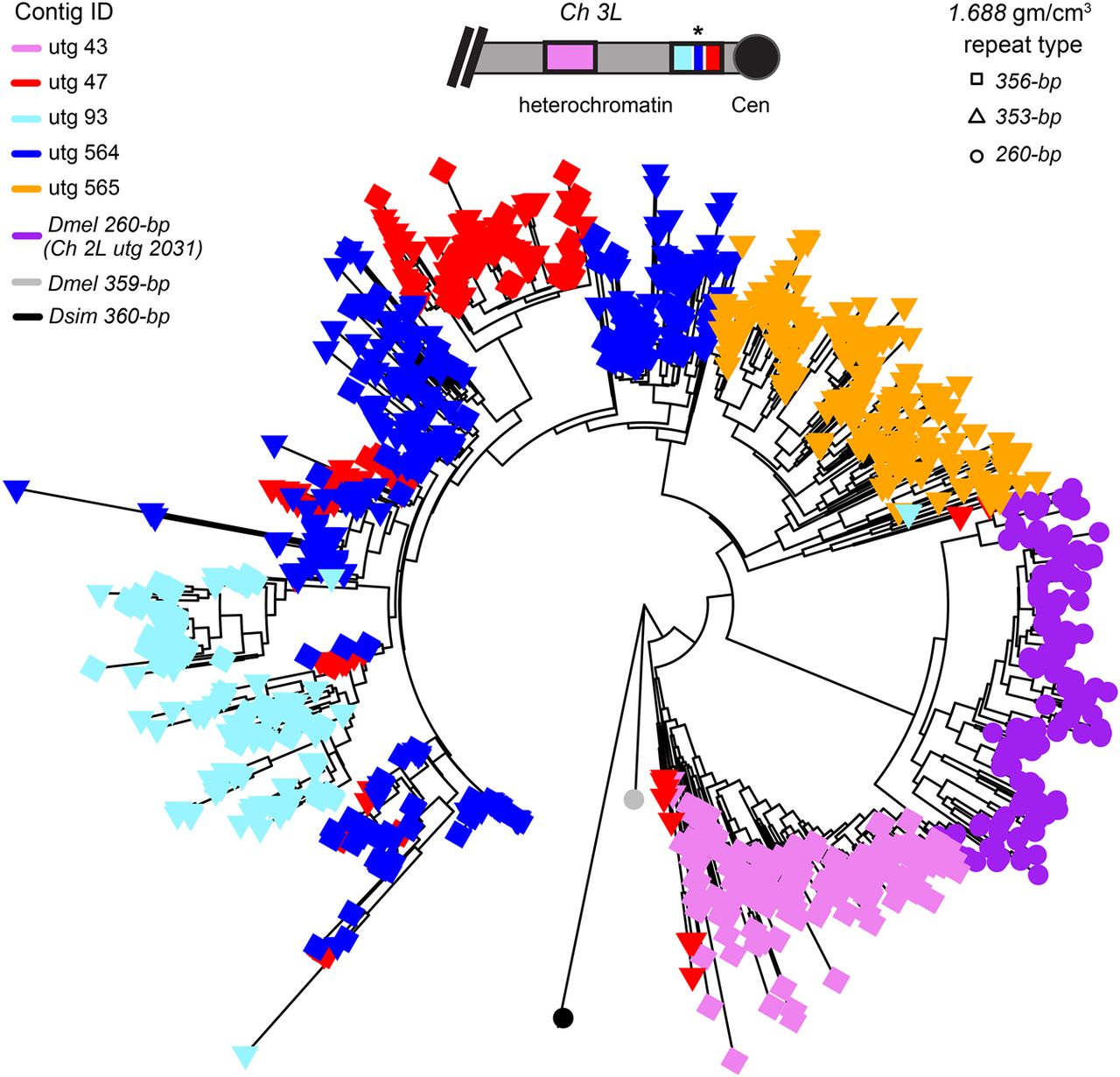 Neighbor-joining tree of D. melanogaster 1.688 family satellites: the 353/356-bp satellites on Chromosome 3L, the 260-bp locus on Chromosome 2L and a single consensus repeat of 359-bp from the X Chromosome, and a related repeat from D. simulans (360-bp). Tips are colored according to the contig from which they originate. The tip symbol refers to monomer repeat type: 353-bp, 356-bp, or 260-bp. The inset shows a schematic of the Chromosome 3L 1.688 loci and the organization of their respective contigs (the two clusters are ∼2 Mb apart). Contig utg 564 does not align to the reference genome, but we infer its location (*) based on repeats clustering with those in utg 47 and a gap in the reference at this genomic location. Contig utg 565 is unmapped.