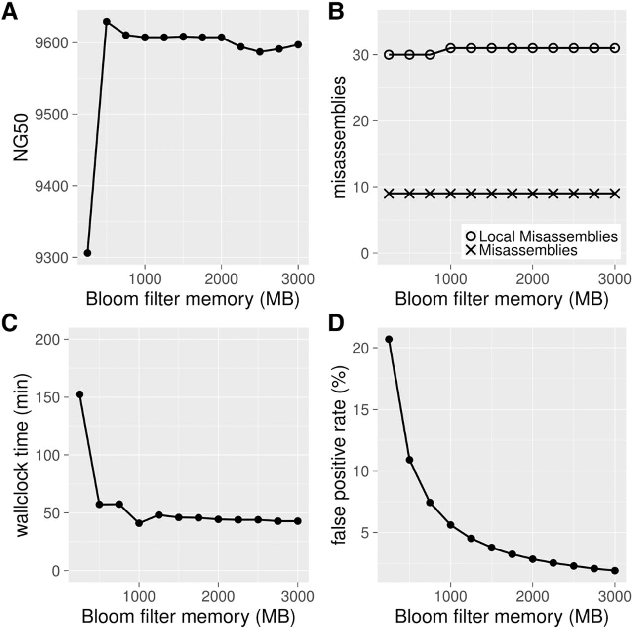 Effect of Bloom filter memory allocation on ABySS 2.0 assemblies of the C. elegans DRR008444 data set. (A) The assembly contiguity (NG50) remains stable in the neighborhood of 9600 bp as the Bloom filter allocation decreases from 3000 MB of 500 MB but drops sharply as the allocation is further decreased from 500 to 250 MB. (B) The number of major misassemblies (9) and local misassemblies (30–31) reported by QUAST remains stable as the Bloom filter allocation is decreased from 3000 to 250 MB. (C) The assembly wall-clock time increases gradually as the Bloom filter allocation is decreased from 3000 to 500 MB but rises sharply from 57 to 152 min when the allocation is further decreased from 500 to 250 MB. (D) The relationship between Bloom filter false-positive rate and the Bloom filter memory allocation. From these results, we conclude that a Bloom filter FPR in the range of 5%–10% provides a good balance between assembly time and memory usage, without any detrimental effect on assembly quality.