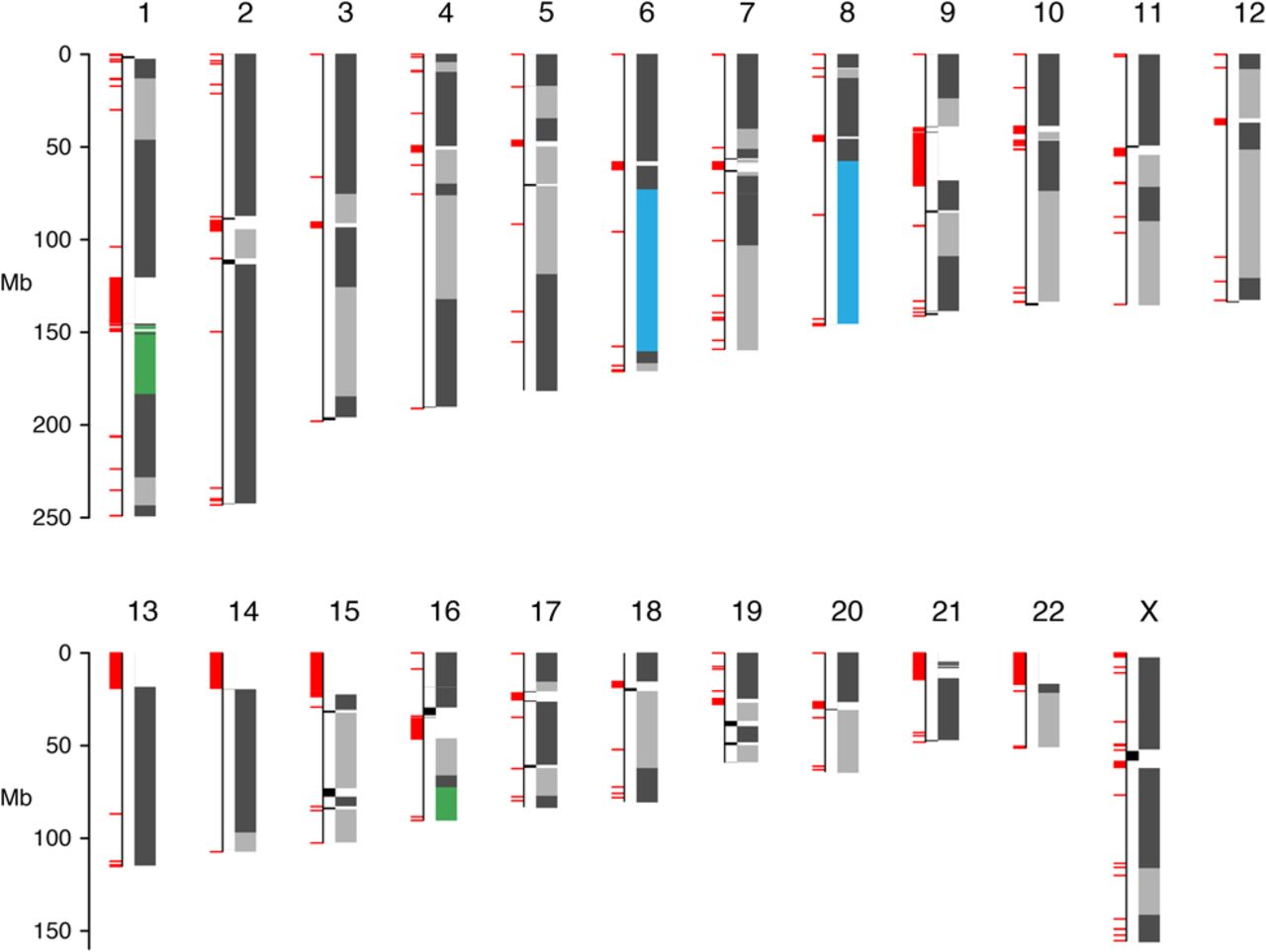 Contigs from the 89 scaffolds >3.2 Mbp that compose 90% of the genome are aligned to GRCh38 using BWA-MEM. Contigs from the same scaffold are shown in the same shade of gray, and alternating shades of light and dark gray are used to distinguish between contigs from different scaffolds. Two translocations, t(1;16) and t(6;8), are shown in green and blue. The segments of the genome that are not covered by alignments of the largest 89 scaffolds are shown offset in black. Gaps in the reference genome, including centromeres and other heterochromatin, are shown in red.
