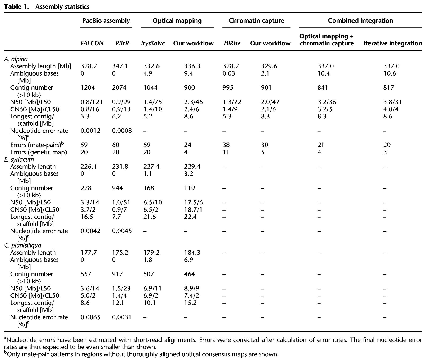 Improving and correcting the contiguity of long-read genome assemblies of three plant species using optical mapping and chromosome conformation capture data