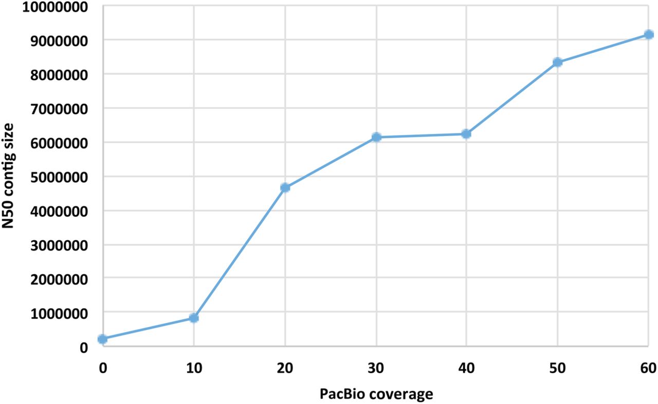 Change in the N50 contig size of genome assemblies using the mega-reads algorithm with varying PacBio coverage and 100× Illumina coverage for the Arabidopsis thaliana genome. At 60×, the N50 size of 9.15 Mb approaches the maximum possible N50 contig size for this genome, which is determined by the sizes of the chromosome arms.