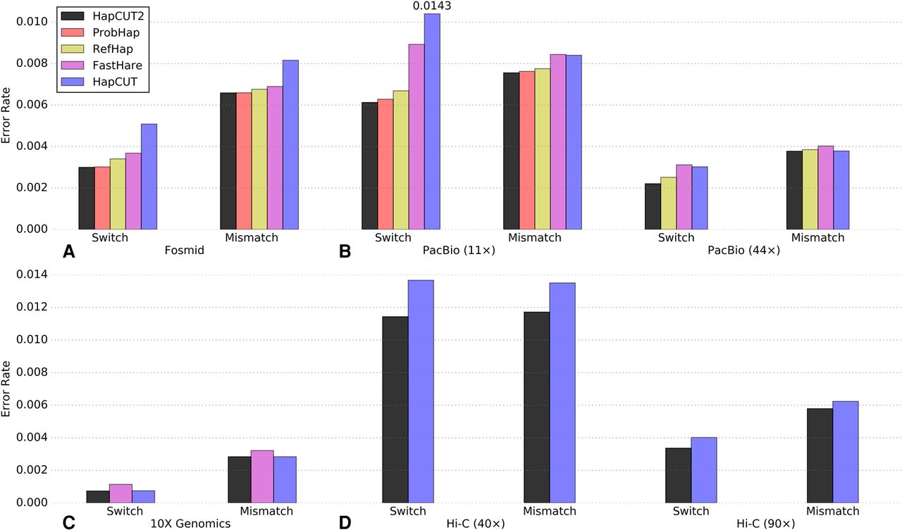 Accuracy of HapCUT2 compared to four other methods for haplotype assembly on diverse whole-genome sequence data sets for NA12878. (A) Fosmid dilution pool data (Duitama et al. 2012). (B) PacBio SMRT data (11× and 44× coverage). (C) 10X Genomics linked reads. (D) Whole-genome Hi-C data (40× and 90× coverage, created with MboI enzyme). Switch and mismatch error rates were calculated across all chromosomes using the subset of variants that were phased by all methods. For each data set, only methods that produced results within 20 CPU-h per chromosome are shown.