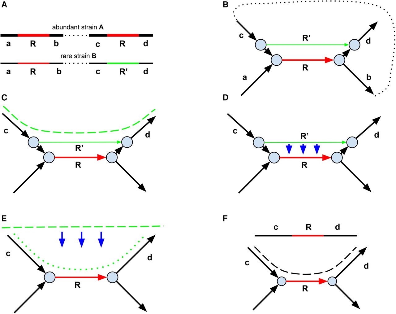 Repeat resolution in metagenomic assembly. (A) One of two identical copies of a long (longer than the insert size) repeat R (red) in the abundant strain has mutated into a unique genomic “green” region R′ in the rare strain. (B) The assembly graph resulting from a mixture of reads from the abundant and rare strains. Two alternative paths between the start and the end of the green edge (one formed by a single green edge and another formed by two black and one red edge) form a bulge. (C) The strain-contig spanning R′ (shown by green dashed line) constructed by exSPAnder at the “generating strain-contigs” step. (D) Masking of the strain variation at the “transforming assembly graph into consensus assembly graph” step leads to a projection of a bulge (formed by red and green edges) and results in the consensus assembly graph shown in E. The blue arrows emphasize that SPAdes projects rather than deletes bulges, facilitating the subsequent reconstruction of strain-paths in the consensus assembly graph. (E) Reconstruction of the strain-path (green dotted line), corresponding to a strain-contig (green dashed line) at the “generating strain-paths in the consensus assembly graph” step. (F) At the “repeat resolution using strain-paths” step, metaSPAdes utilizes both strain-paths and paired reads to resolve repeats in the consensus graph. The green dotted strain-path from E is used as additional information to reconstruct the consensus contig cRd spanning the long repeat.