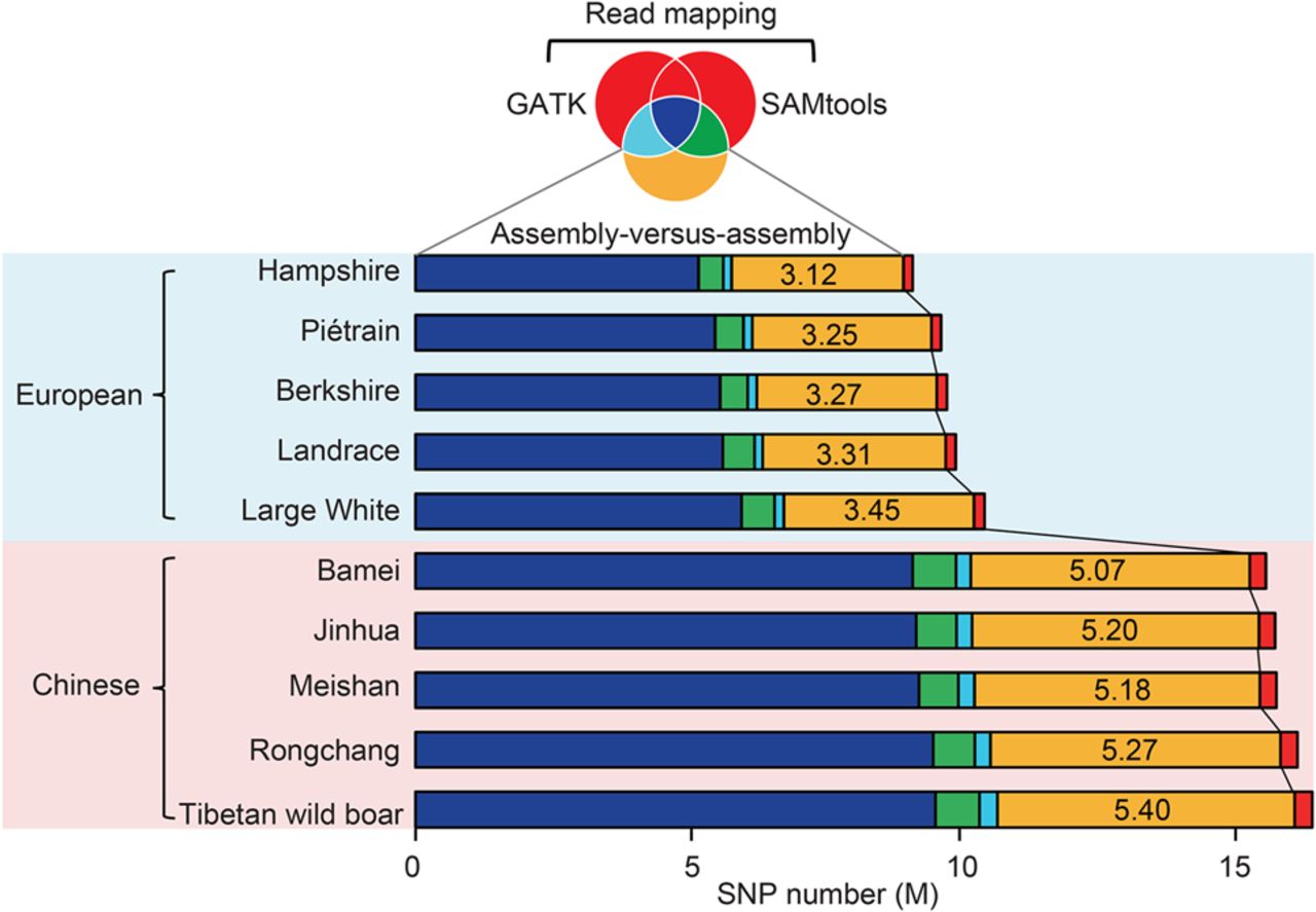 Comparison of SNP calling between the assembly-versus-assembly method and resequencing approaches based on read mapping. The Venn diagram with colors corresponding to the bar chart shows the sharing of identified SNPs among the assembly-versus-assembly method and two resequencing algorithms as implemented in SAMtools and GATK. An average of 4.25 M SNPs per breed were specifically identified by the assembly-versus-assembly method (marked as yellow), while only 0.24 k SNPs per breed were categorized by resequencing approaches (marked as red). A significant fraction of the detected SNPs by SAMtools (8.11 M per individual) and GATK (7.77 M per individual) was coincident (7.41 M; or 91.24% of SAMtools and 95.34% of GATK) (Supplemental Fig. S8).