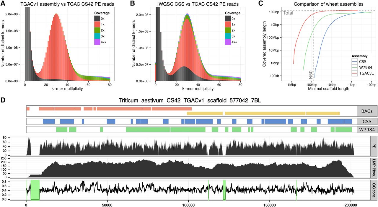 Summary of the TGACv1 wheat genome sequence assembly. (A,B) KAT spectra-cn plots comparing the PE reads to the TGACv1 scaffolds (A) and CSS scaffolds (B). Plots are colored to show how many times fixed length words (k-mers) from the reads appear in the assembly; frequency of occurrence (multiplicity; x-axis) and number of distinct k-mers (y-axis). Black represents k-mers missing from the assembly; red, k-mers that appear once in the assembly; green, twice; etc. Plots were generated using k = 31. The black distribution between k-mer multiplicity 15 and 45 in B represents k-mers that do not appear in the CSS assembly. (C) Comparison of scaffold lengths and total assembly sizes of the TGACv1, W7984, and CSS assemblies. (D) Scaffold 577042 of the TGACv1 assembly. Tracks from top to bottom: aligned BAC contigs, CSS contigs, W7984 contigs, coverage of PE reads, coverage of LMP fragments, and GC content with scaffolded gaps (N stretches) with 0% GC highlighted in green. There are two BACs (composed of seven and four contigs each), 22 CSS contigs, and 15 W7984 contigs across the single TGACv1 scaffold.