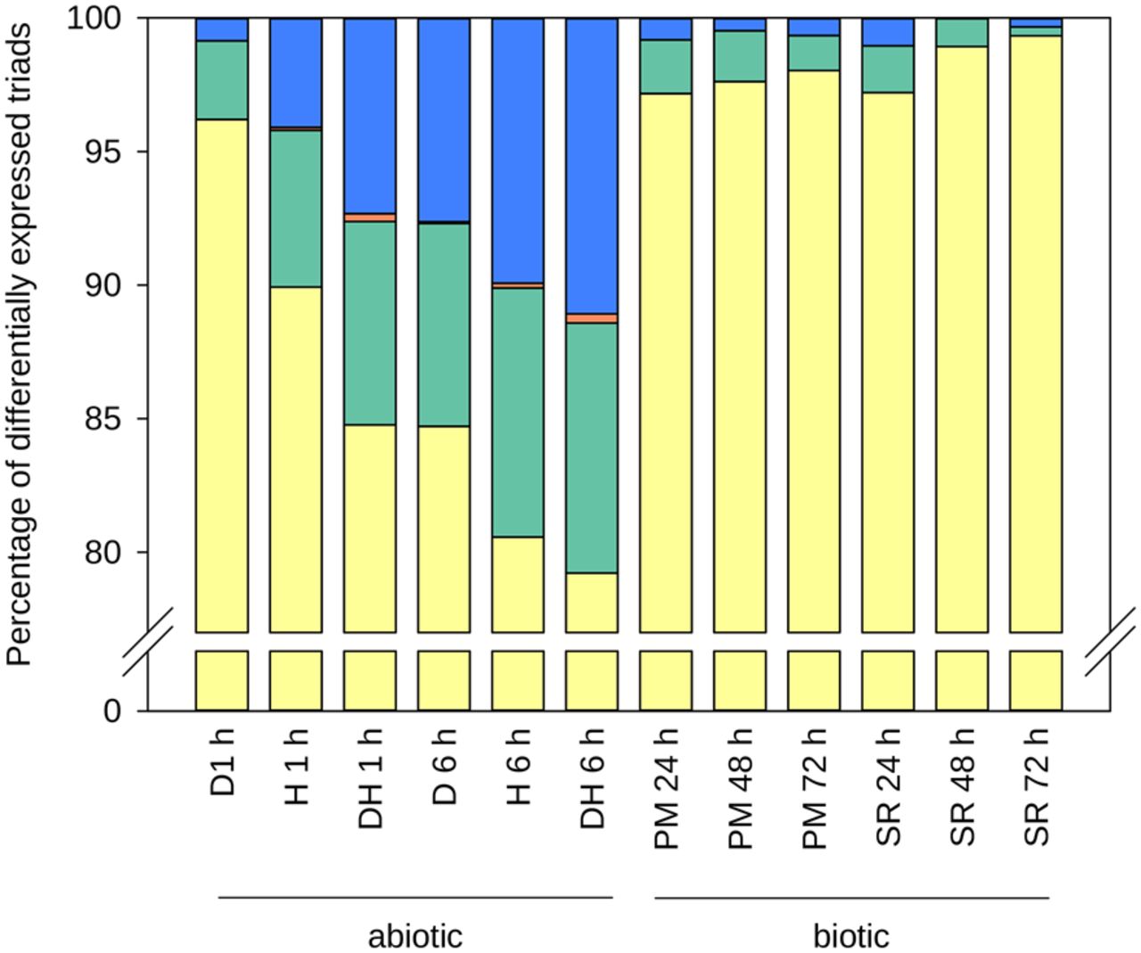 Response of differentially expressed (DE) triads to stress treatments according to the number and pattern of DE homoeologs. Triads were classified as having one homoeolog DE (yellow), two homoeologs DE with same direction of change (green), three homoeologs DE with same direction of change (orange), or opposite direction of change between DE homoeologs (blue). The stresses applied were drought (D), heat (H), drought and heat combined (DH), powdery mildew (PM), and stripe rust (SR), with the duration of stress application indicated in hours (h).