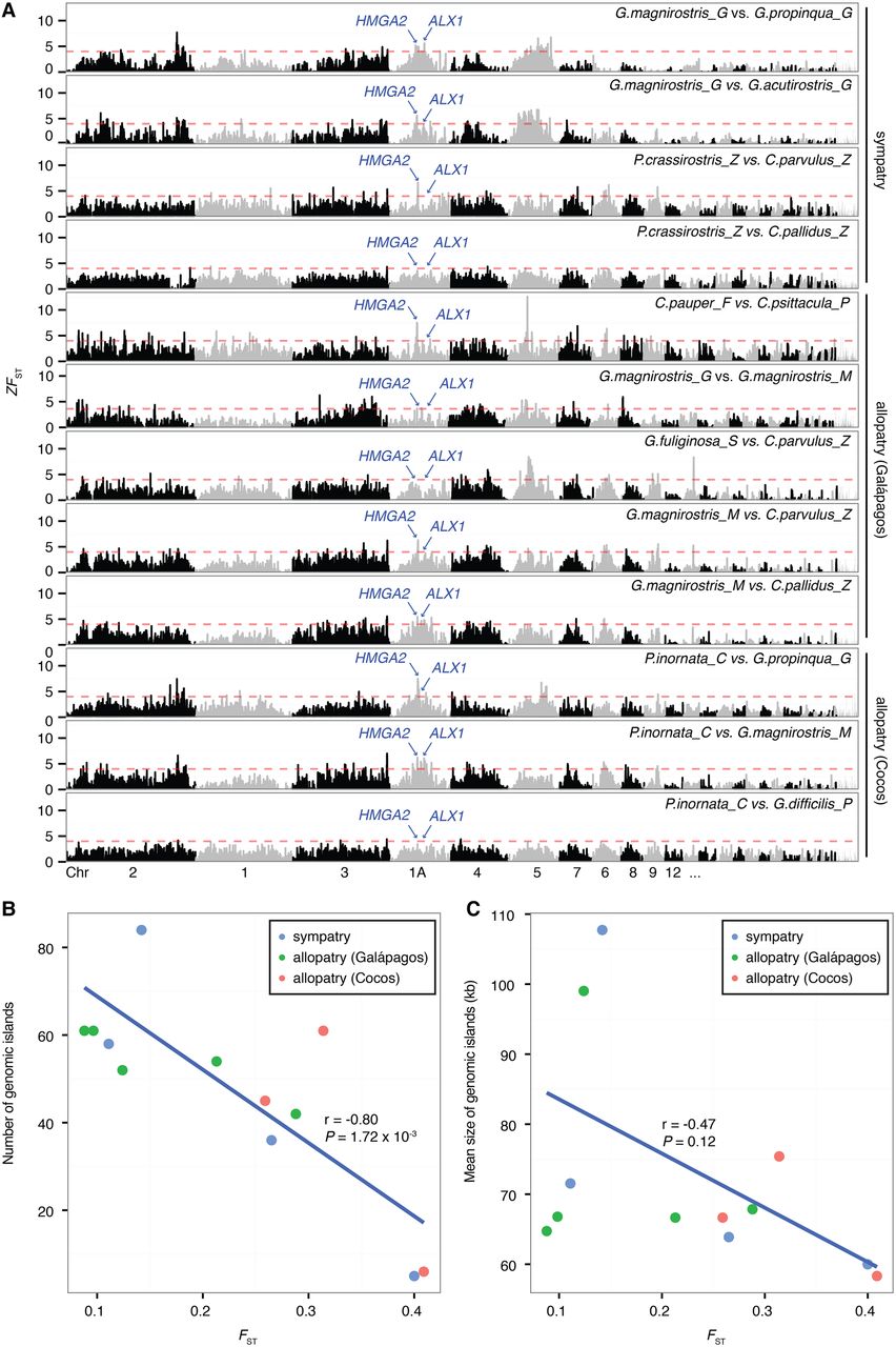 Landscape of divergence across the genome and correlation between genomic islands and genome-wide divergence. (A) Genome-wide ZFST screen in 50-kb windows across 12 species pairs of Darwin's finches. Scaffolds were ordered along the zebra finch genome, and chromosomes are numbered according to the zebra finch nomenclature. Red dashed lines indicate a ZFST of four as the threshold to define islands of divergence. Genomic locations of the ALX1 and HMGA2 related to beak morphology are indicated. (B) Number of genomic islands against genomic divergence. (C) Mean size of genomic islands against genomic divergence. Each dot represents a species pair. Correlations are tested with Pearson's correlation coefficient test.