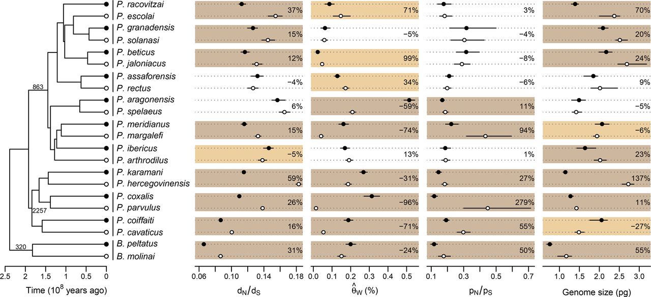 and pN/pS), and haploid genome size measurements for 11 pairs of surface and subterranean asellid species. Vertical bars next to the