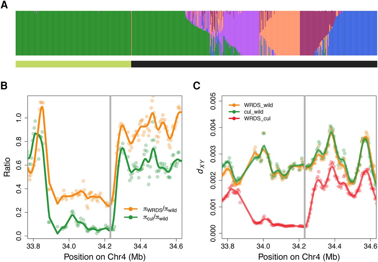 sh4 haplotypes in wild and domesticated rice populations. (A) Local ancestry inference at sh4 locus for K = 5. The bar at the bottom denotes O. sativa (green) and O. rufipogon (black) accessions, respectively. (B) Diversity reduction at the selective sweep region of sh4. The y-axis shows the ratio of pairwise differences estimator (π) of nucleotide diversity among populations. (C) dXY values between populations at the selective sweep region of sh4. The gray line indicates the sh4 gene region in B and C.