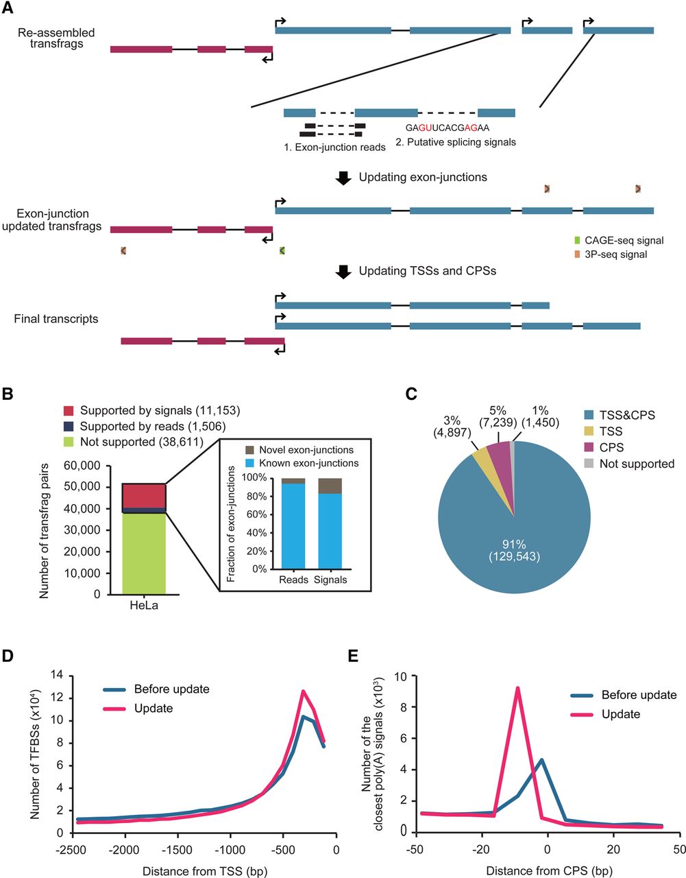 Updating exon junctions, TSSs, and CPSs in transfrag models. (A) Shown is a workflow for updating transfrag models, which comprises two steps: (1) updating exon junctions, and (2) updating TSSs and CPSs. (B) The number of neighboring transfrag pairs supported by putative splicing signals (red), by exon-junction reads (navy), and by neither (olive) in HeLa cells. The numbers in parentheses in the key indicate the number of pairs in each group. Among exon junctions supported by either exon-junction reads or putative splicing signals, the fractions of known (cyan) and novel (gray) exon junctions in GENCODE annotations are shown in the inset. (C) The fraction of transfrags updated with both TSS and CPS (blue), with only TSS (yellow), with only CPS (magenta), and with neither TSS or CPS (gray) in HeLa cells. (D) The number of TFBSs upstream of the original 5′ end (blue) and of the 5′ end updated with a TSS (pink) in HeLa cells. (E) The number of transfrags with a close poly(A) signal, AAUAAA, over the relative distances from the original 3′ end (blue) and the 3′ end updated with a CPS (pink) of transfrags in HeLa cells.