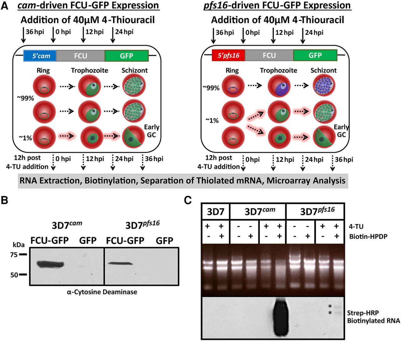 Stage-specific pyrimidine salvage for detection of early gametocyte transcription. To measure mRNA from a subpopulation of cells, we expressed FCU-GFP under the control of the gametocyte-specific promoter pfs16 in the 3D7 parasite line (3D7pfs16). (A) Schematic representation of the experimental design including the timing of 4-TU incubation (black arrows) and RNA extraction (dashed black arrows), plasmids transfected into P. falciparum strains, and a depiction of the highly synchronous cell populations that express cam- and pfs16-fcu-gfp throughout the 48-h IDC. All parasites express FCU-GFP from the constitutive cam promoter (green) regardless of developmental stage (left, 100% GFP+). Only a small proportion (∼1% GFP+) of parasites becoming committed (dashed highlighted arrows) during the IDC, and those that have entered gametocytogenesis in the previous cycle and are sexually committed rings express FCU-GFP from the pfs16 promoter (green), whereas asexual parasites do not (right, ∼99% GFP−). (B) FCU-GFP protein from uninduced asexual cultures of 3D7cam and 3D7pfs16 was detected by Western blot probed with anti-yeast cytosine deaminase. (C) Detection of the subpopulation of FCU-mediated thiol-tagged RNA was carried out by incubating highly synchronized P.f. 3D7, 3D7cam, and 3D7pfs16 in the presence or absence (top) of 40 µM 4-TU for 12 h. Total RNA was extracted, biotinylated, and assayed by Northern blot probed with Streptavidin-HRP (bottom), demonstrating that thiol tagging occurs at a much lower level in 3D7pfs16 (*) than in 3D7cam, representing the minor sexual-stage parasite subpopulation.