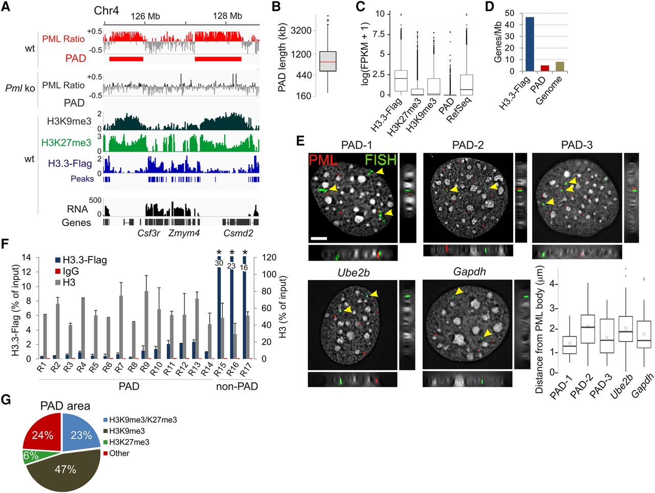 PML associates with large heterochromatin domains. (A) ChIP-seq profiles of PML in wt and Pml ko MEFs and of H3K9me3, H3K27me3, and H3.3-Flag in wt MEFs; data are shown as log(ChIP/input) ratios. RNA-seq counts (FPKM) are shown. (B) PAD length (median, 0.8 Mb). (C) Expression levels of genes enriched in H3.3-Flag, H3K27me3, and H3K9me3; genes in PADs; and of all RefSeq genes in wt MEFs. (D) Gene density within H3.3-Flag peaks, in PADs, and in the whole genome. (E) Immuno-FISH analysis of PML (showing PML bodies; immunolabeling, red signal) and PADs (green signal; arrows; FISH probes). Ube2b and Gapdh are shown as genes outside PADs. Planar and orthogonal views are shown. Bar, 5 µm. Graph indicates distribution of FISH probe distances to nearest PML body (about 60 FISH signals analyzed). (F) ChIP-qPCR of H3.3-Flag and total H3 in indicated PAD and non-PAD regions in wt MEFs. (*) P < 0.01 relative to H3.3-Flag at all other sites; two-tailed t-tests; mean ± SD, three experiments. See Supplemental Table 4 for position of amplicons. (G) PAD area coverage by H3K9me3 and/or H3K27me3 peaks in wt cells.