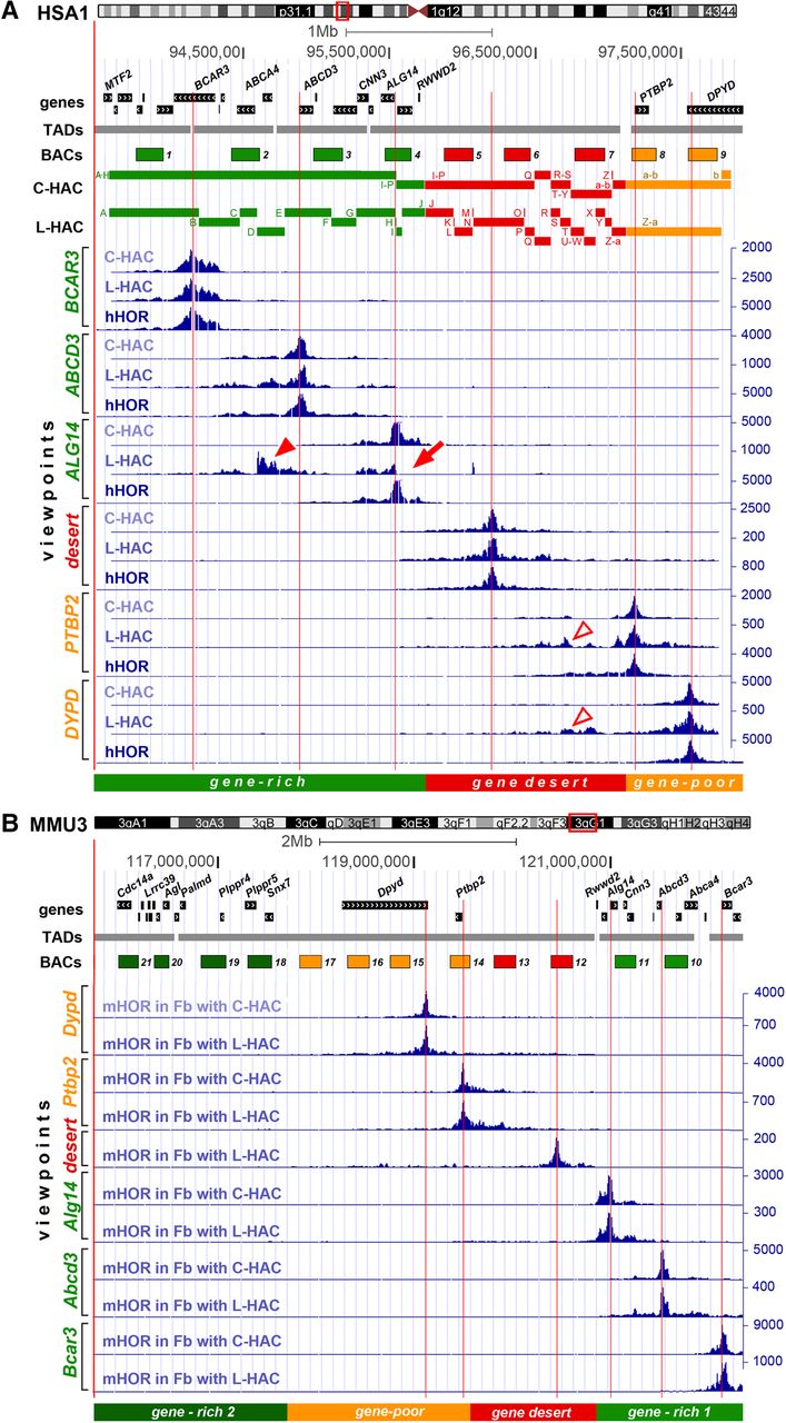 Structure and 4C-seq intrachromosomal contact profiles of the human region (hHOR) within the endogenous Chromosome 1 (HSA1) and HACs (A) and of the mouse endogenous region (mHOR) within Chromosome 3 (MMU3) (B) visualized by the UCSC Genome Browser. The sequence features of the chromosomal loci indicated by red open rectangles in the chromosome ideograms are viewed below the ideograms. Tracks, ordered from top to bottom, are: genes, TADs, BACs used for fluorescence in situ hybridization (FISH) in this study, C- and L-HAC sequence blocks, 4C-seq contact profiles of six viewpoints, division of the regions into segments according to gene abundance. The gene-rich segment is highlighted in light-green; gene-desert and gene-poor segments in red and yellow, respectively. BACs are marked as 1–9 and 10–21 for human and mouse regions, respectively; for the real BAC names, see Supplemental Table S1. An additional flanking gene-rich segment and corresponding BACs for the mouse region are depicted in dark green (B). Note that mHOR has an inverted orientation in comparison with hHOR. Vertical red lines indicate 4C-seq viewpoints. 4C-seq values are shown on the right y-axis in blue. Blocks of rearranged sequences in C-HAC and L-HAC are indicated in A and marked by letters A–Z/a-b as in Figure 1. Arrow and arrowheads point at L-HAC contact profiles regions noticeably altered compared to hHOR as a result of HAC structural rearrangements, such as abrupt depletion of contacts (arrow) and additionally gained contacts (arrowheads).