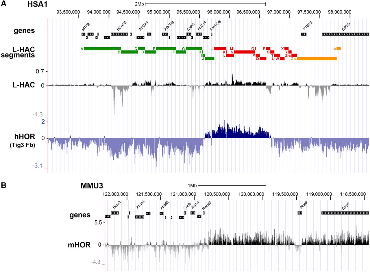 Nuclear lamina interactions of L-HAC in comparison to hHOR and mHOR. (A) DamID profile of nuclear lamina (NL) interactions (Dam-Lamin B1/Dam log2 ratio) along the L-HAC in mouse A9 cells and along the corresponding region of human Chromosome 1 (HSA1) in human lung fibroblasts (Tig3 Fb; data from Guelen et al. 2008). (B) DamID profile along the mHOR on mouse Chromosome 3 (MMU3) in A9 cells carrying L-HAC. Annotation tracks are as in Figures 1 and 2.