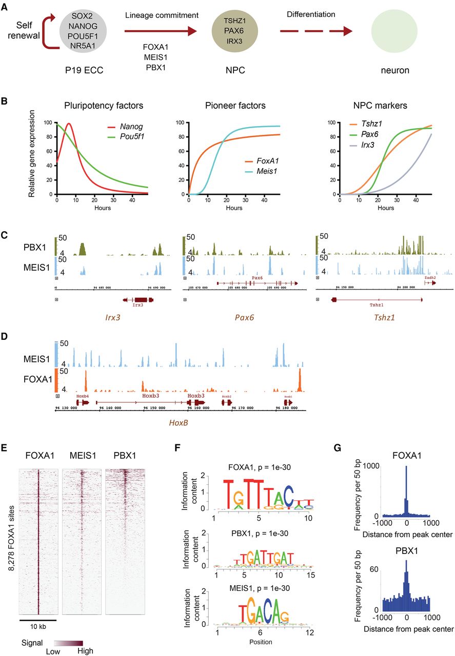 Pioneer factors and NPC differentiation. (A) Pluripotent P19 EC cells derive from a 6.5-dpc mouse embryo and can differentiate into neural progenitor cells (NPCs) when treated with retinoic acid (RA). Pluripotency factors expressed in these cells include POU5F1, NANOG, SOX2, and NR5A1. Under the influence of RA, FOXA1, MEIS1, and PBX1 are induced and control the commitment of P19 EC cells to NPCs which express marker genes like Tshz1, Pax6, and Irx3. (B) RT-qPCR analysis of marker gene expression during 48 h of NPC differentiation after addition of RA. Curves were fitted with the GraphPad Prism software. (C) NPC marker genes are direct targets of TALE-HDs. Integrated Genome Browser (IGB) screenshots showing MEIS1 and PBX1 ChIP-seq signals at Irx3, Pax6, and Tshz1 loci in RA-treated cells. (D) IGB screenshot of FOXA1 and MEIS1 ChIP-seq signals from NPCs at the HoxB cluster, showing that FOXA1 and MEIS1 share common binding sites. (E) Heat maps showing FOXA1, MEIS1, and PBX1 ChIP-seq signals at 8278 FOXA1 sites in P19 cell-derived NPCs. (F) Logos of motifs enriched at FOXA1 binding sites. (G) Distribution of FOXA1 and PBX1 motifs in 50-bp windows centered on FOXA1 binding sites.
