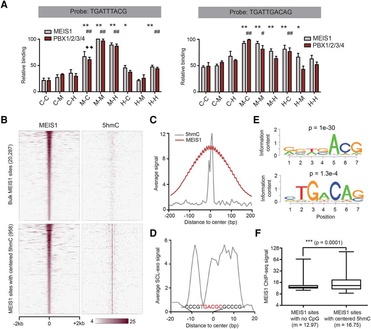DNA binding by TALE-HD proteins is sensitive to cytosine modifications. (A) MEIS1 and PBX1/2/3/4 in vitro interaction with differentially modified synthetic PBX1/HOXA9 (left panel) and MEIS1/PBX1 (right panel) probes. Results are expressed according to the strongest binding equivalent to 100 (C: unmodified cytosine; M: methylated cytosine; H: hydroxymethylated cytosine; first letter: upper strand; second letter: lower strand). Statistical significance of differential binding to modified probes compared to the unmodified probe was tested with a Mann-Whitney test (n = 5; MEIS1 protein: [*] P < 0.05, [**] P < 0.01; PBX1/2/3/4: [#] P < 0.05, [##] P < 0.01). For PBX1 binding, ♦♦ corresponds to P < 0.01 between M-C and M-H conditions. (B) Heat maps of MEIS1 ChIP-seq and SCL-exo (5hmC) signals at 20,287 bulk MEIS1 binding sites (upper panels) and 958 MEIS1 sites showing a centered SCL-exo signal (lower panels) in P19 cell-derived NPCs. (C) Average MEIS1 ChIP-seq (red curve) and SCL-exo (gray curve) signals at the 958 MEIS1 binding sites showing a centered SCL-exo signal in P19 cell-derived NPCs. Note that oscillations in the MEIS1 profile are due to the lower resolution of the MEIS1 ChIP-seq .wig file compared to the SCL-exo .wig file. (D) Average SCL-exo signal over 40 bp for the cluster of 958 MEIS1 sites depicted in B. The consensus sequence determined from the aligned 958 sequences with the software CLC Sequence Viewer 6 is indicated on the graph. A motif related to the TGACAG consensus MEIS1 motif has been highlighted in red font. (E) Examples of de novo motifs found enriched (P-value is indicated above the logos) by the SeqPos motif tool from Cistrome. (F) Box plot analysis of MEIS1 ChIP-seq signal for MEIS1 sites with no CpGs within the ChIP-seq peaks (n = 3628) and the 958 MEIS1 sites with centered SCL-exo signal (m = mean ChIP-seq signal).