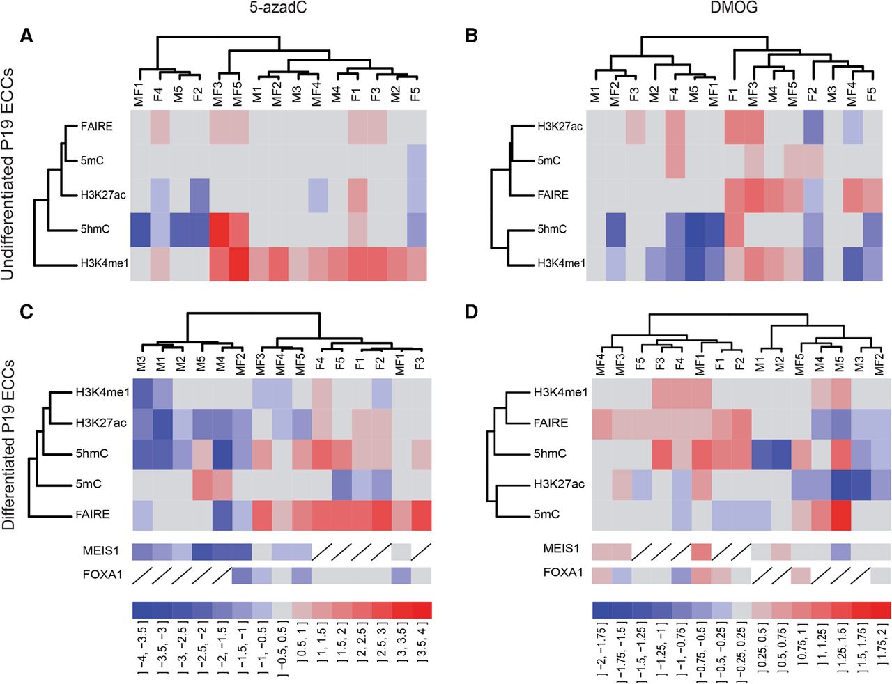 Cytosine modifications regulate enhancer priming. Dendrograms and heat maps from hierarchical clustering of enhancer features (left dendrogram) and the 15 selected enhancers studied (top dendrogram). (A,B): undifferentiated P19 ECCs. (C,D): differentiated neural progenitors. The color scale bars at the bottom of each column indicate log2-transformed fold-change between control cells and cells treated with the inhibitor, with a scale of 0.5 for 5-azadC (A,C) and 0.25 for DMOG (B,D). Variations in MEIS1 and FOXA1 recruitment are represented below heat maps in panels C and D but were not used for hierarchical clustering.