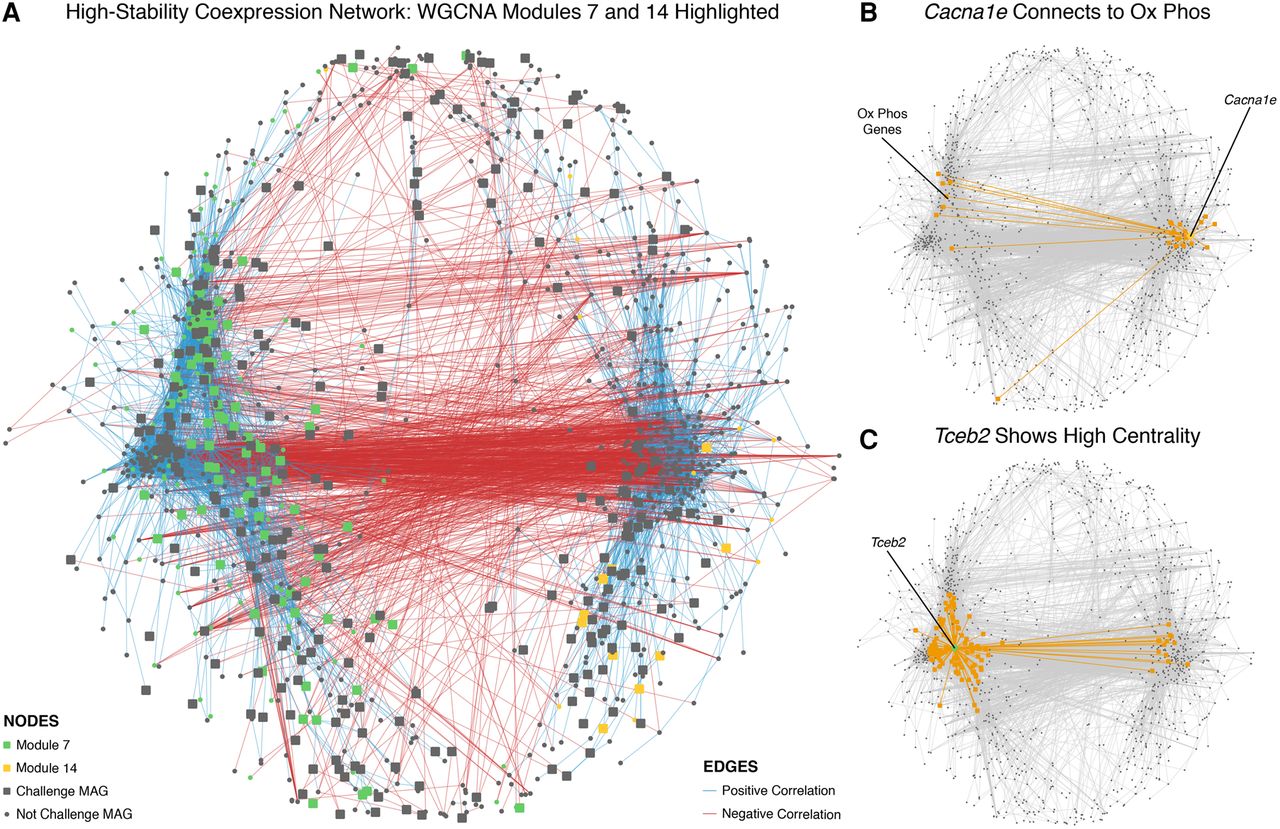(A) Coexpression network of plotting the largest connected component with all relationships with correlations of an absolute value of 0.85 or better. The network topology includes two sides connected by a profusion of negative correlations. Module 7 nodes (green), which are associated with oxidative phosphorylation, inversely connect to module 14 nodes (yellow), which are associated with ion channels. (B) The gene with the highest betweenness centrality in module 14, Cacna1e, connects to many oxidative phosphorylation genes. Edges connecting out from Cacna1e and the nodes they connect to are highlighted in orange. (C) The gene with the highest betweenness centrality in module 7, Tceb2, implies a role for transcriptional regulatory dynamics. Edges connecting out from Tceb2 and the nodes they connect to are highlighted in orange.