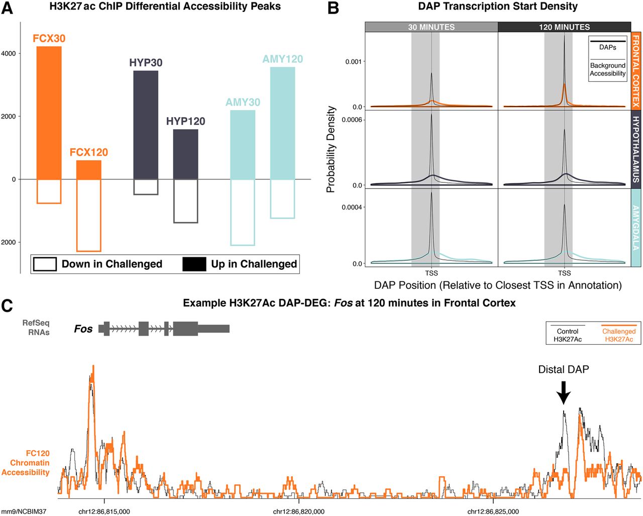 (A) H3K27ac DAPs in pairwise comparisons at a threshold of twofold. Solid bars above the x-axis represent peaks with increased accessibility in experimental samples relative to control. Outlined bars below the x-axis represent peaks with decreased accessibility in experimental samples. (B) Probability density of locations of differential accessibility in a 30-kb window around TSS sites. While the highest density of DAPs still lies within 5 kb upstream of or 2 kb downstream from (gray boxes) the TSS, the majority of DAPs are distal. Relative to background accessibility (thin black lines), DAPs have lower density near the TSS and higher density at distal sites. (C) Example distal differential accessibility peak in a known distal enhancer element for the immediate early gene Fos in FCX at 120 m after challenge.