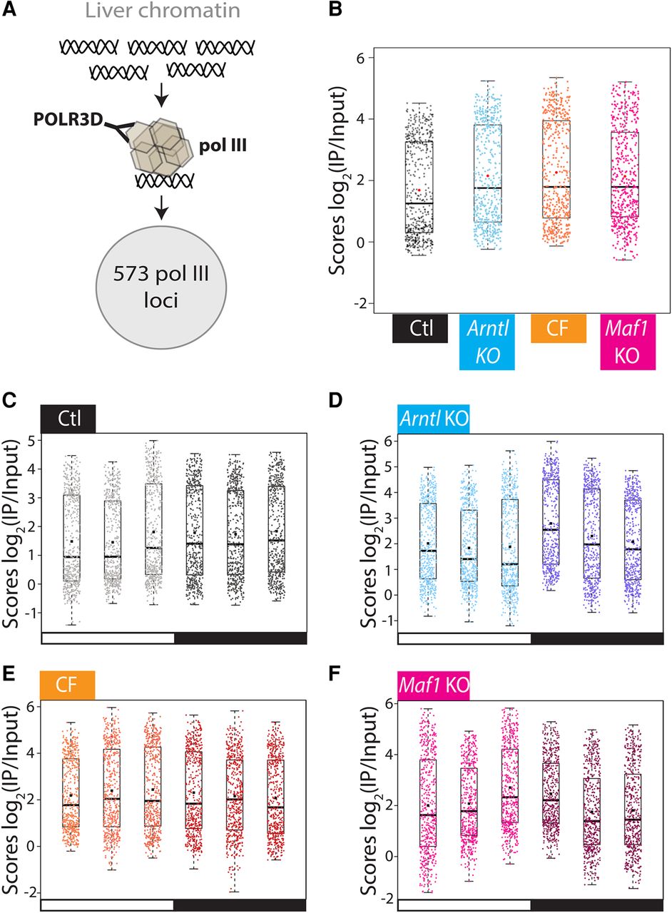 Pol III gene occupancy increase in CF, Arntl KO, and Maf1 KO mice. (A) ChIP-seq was performed with an antibody directed against POLR3D (RPC4), a Pol III subunit, with pools of three liver samples from 12- to 14-wk-old mice collected every 4 h during two consecutive days. Five hundred seventy-three loci significantly occupied by Pol III in at least one sample in one of the conditions were analyzed. (B) Box plot showing, for each of the 573 loci, the mean of all scores [log2(IP/Input)] in all time points (12 samples per condition) for control, CF, Arntl KO, and Maf1 KO liver samples. The mean and median of the 573 loci are represented with a black squared dot and a black line, respectively. (C) Box plot showing the mean score of two biological replicates at each time point for the 573 loci. (D) As in C, but for the Arntl KO mice. (E) As in C, but for the CF mice. (F) As in C, but for the Maf1 KO mice.