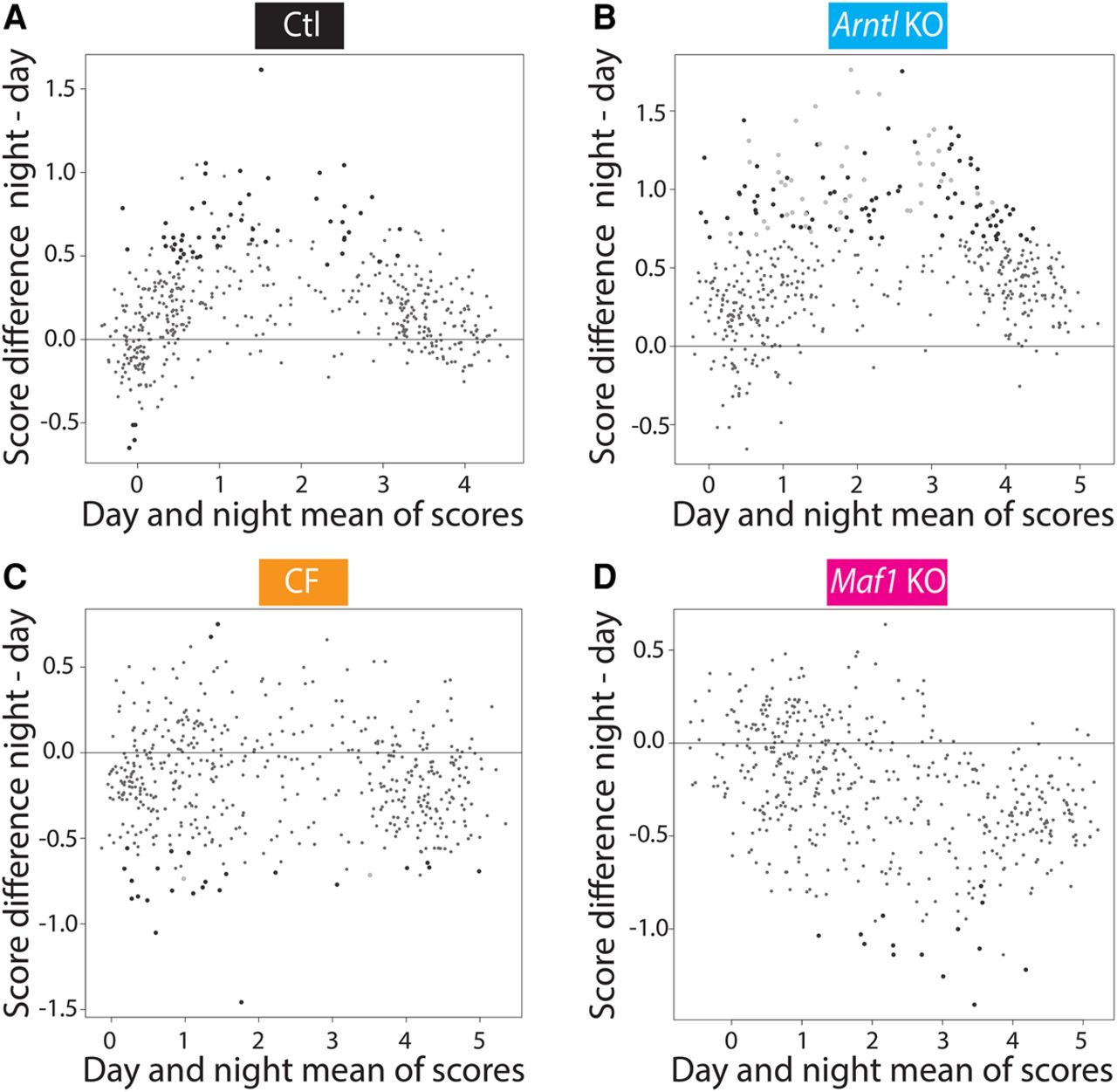 Nutrient-dependent increase of Pol III gene occupancy. (A) MVA plot comparing day and night average scores. For each locus, the three day scores were averaged and the three night scores were averaged. The MVA plot shows the average of day averages and night averages on the x-axis and the difference of night average – day average scores on the y-axis. Large black dots represent genes with significantly different day average and night average scores (P-value <0.05), as calculated with limma. (B) As in A, but for Arntl KO mice. The large black dots represent genes changing with a P-value <0.05 only in the Arntl KO mice, and the large gray dots represent genes changing with a P-value <0.05 in both the control and the Arntl KO mice. (C) As in A, but for the CF mice. The large black dots represent genes changing with a P-value <0.05 only in the CF mice, and the large gray dots represent genes changing with a P-value <0.05 in both the control and CF mice. (D) As in A, but for the Maf1 KO mice. The large black dots represent genes changing with a P-value <0.05 only in the Maf1 KO.