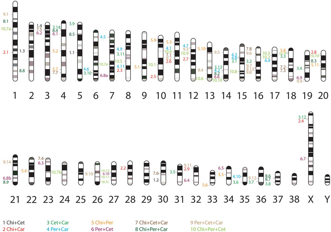 Ideogram representing the genomic locations of the 102 retrotransposon markers in the dog genome. The numbers to the left of the chromosomes represent the order pairs/triplets that are supported and serial number of the marker in that group. Six duplicated regions (but each with consensus presence/absence patterns) are indicated with lowercase letters (a–f). In addition, the colors of the numbers indicate the order pair/triplet affiliation to which the marker belongs, according to the legend at the bottom (Supplemental Table S1a): (Chi) Chiroptera, (Cet) Cetartiodactyla, (Car) Carnivora, (Per) Perissodactyla. The dog chromosome ideogram is based on the DAPI banded karyotype presented in Breen et al. (1999).