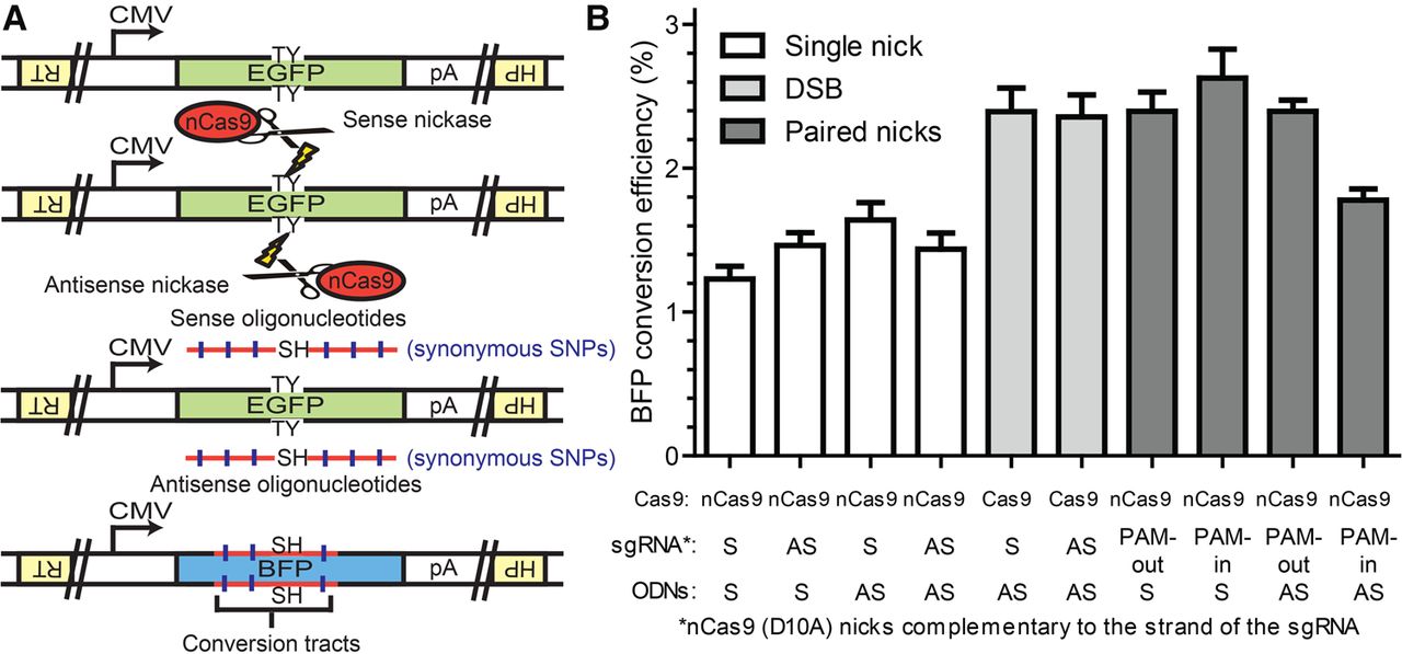 The EGFP to BFP conversion system in the HPRT1-EGFP antisense cell line. (A) Schematics of the EGFP to BFP conversion system in the HPRT1-EGFP antisense cell line. An EGFP expression cassette was knocked into the HPRT1 locus of the HCT116 cell line (only the antisense orientation is diagrammed here for the sake of ease of presentation). Genomic lesions could then be introduced near the chromophore (TY residues) of the EGFP sequence using CRISPR/Cas9 cleavase, nickases, or dual nickases. HDR repair of the genomic lesions using ODN donors containing the sequence of the SH residues leads to the conversion of EGFP to BFP. The ODN donors also contained synonymous SNPs that could be coconverted with the sequence of the SH residues. Schematic elements: EGFP, green boxes; BFP, blue boxes; HPRT1, inverted yellow boxes; sequences of the chromophore residues, TY and SH; the cytomegalovirus promoter, CMV; the polyadenylation sequence, pA; Cas9 variants, red ovals with scissors; genomic lesions, lightning bolts; ODN donors, horizontal red lines; synonymous SNPs, vertical blue hash marks. (B) The efficiency of BFP conversion in the HPRT1-EGFP antisense cell line. The wild-type Cas9 and D10A variant are labeled as Cas9 and nCas9, respectively. The strandedness (S, sense; AS, antisense) of the sgRNA and ODNs (for this experiment without synonymous SNPs) are labeled with respect to the coding sequence of EGFP. Note that the Cas9 D10A variant nicks the strand complementary to that of the sgRNA. All data are shown as the mean ± SEM of three biological replicates.