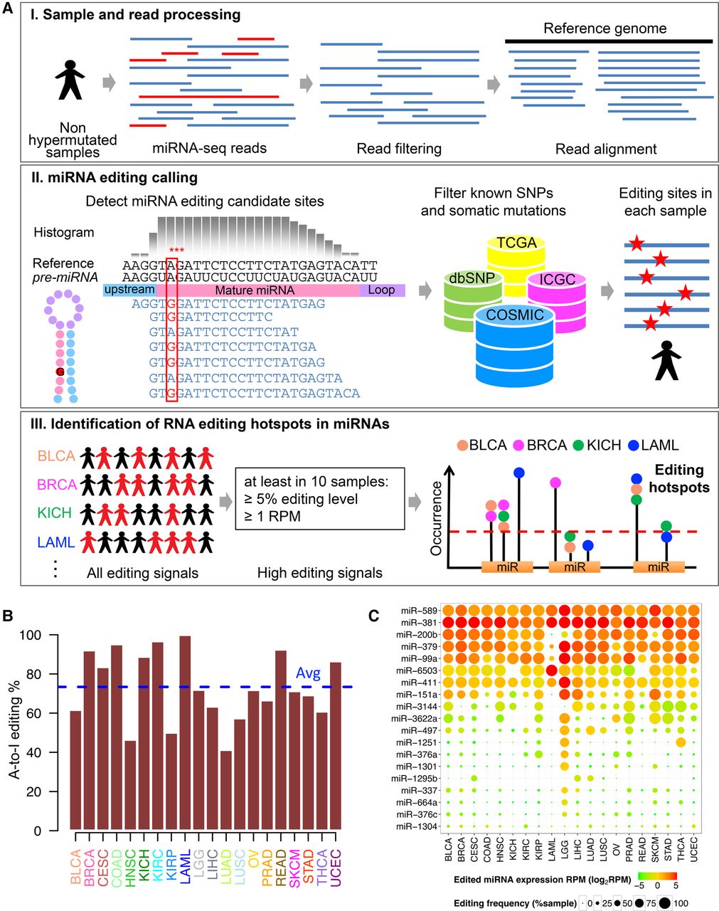 Overview of bioinformatic pipeline and RNA editing profiles in miRNAs across cancer types. (A) Schematic of bioinformatic pipeline. For each cancer type, sample and read processing, miRNA editing calling (filtering DNA variants using various resources), and identification of miRNA editing hotspots. (B) Proportions of A-to-I RNA editing events among all RNA editing events observed at hotspots in different cancer types; average proportion across 20 cancer types is 73.4%. (C) Heat map of miRNA editing hotspots. Edited miRNA expression amounts (log2RPM) are in color; editing frequencies (% of samples with editing signals) are indicated by circle size.