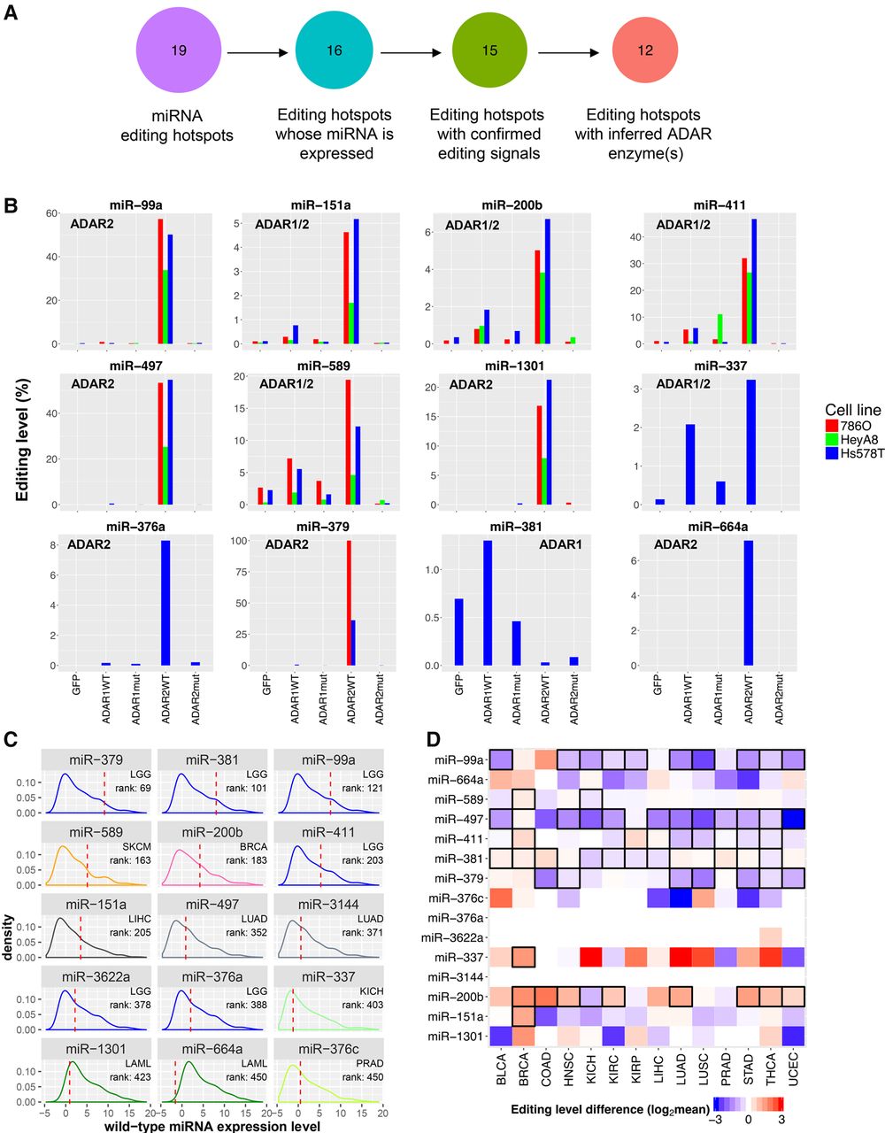 Validation and molecular profiles of cancer miRNA editing hotspots. (A) Numbers of miRNA editing hotspots in the analysis of ADAR-perturbation experiments in 786O, HeyA8, and Hs578T cell lines. (B) The editing level changes after transfection of wild-type ADAR enzymes (ADAR WT), and inactive ADAR enzymes (ADAR mut). Inferred ADAR determinant(s) of each miRNA editing hotspot are shown in each miRNA subpanel. (C) For each edited miRNA, the highest rank of the edited miRNA expression amount (upper-quartile value across samples in a cancer type) relative to the WT miRNA expression amounts (median value) across cancer types is shown. (D) A heat map showing editing-level differences of 19 miRNA editing hotspots between cancerous and matched normal samples (two-sided paired Wilcoxon rank test, n ≥ 5). Red indicates overediting and blue indicates underediting in cancer samples; boxes highlight significant differences (FDR < 0.05).