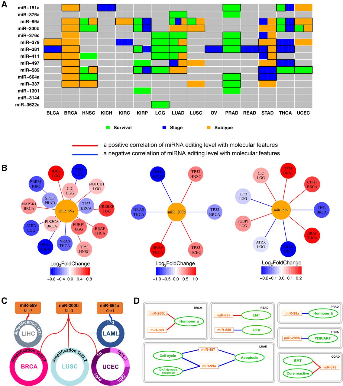 Correlation of miRNA editing hotspots with clinical features, molecular drivers, and signaling pathways. (A) A heat map showing the clinical relevance of miRNA editing hotspots. Significant correlations with tumor subtype (orange, two-sided Wilcoxon or Kruskal-Wallis test), disease stage (blue, two-sided Wilcoxon or Kruskal-Wallis test), and patient survival times (green, univariate Cox proportional hazards model or log-rank test for median-based two-group comparison) (FDR < 0.2); after considering tumor purity, boxes highlight remaining significant correlations. (B) Significant correlations between the miRNA editing levels and significantly mutated genes (the gene nodes are colored according to the fold change between the mutated samples and the WT sample groups; two-sided Wilcoxon test, FDR < 0.05). The specific cancer types showing the significant correlations are listed below gene names. (C) Correlations between the miRNA editing levels and frequent SCNAs (Spearman rank correlation, |RS| > 0.5 and FDR < 0.05). (D) Correlations between the miRNA editing levels and signaling pathway scores (derived from TCGA protein expression data; Spearman rank correlation, |RS| > 0.3 and FDR < 0.05). Red lines indicate positive correlations, while blue lines are negative correlations.