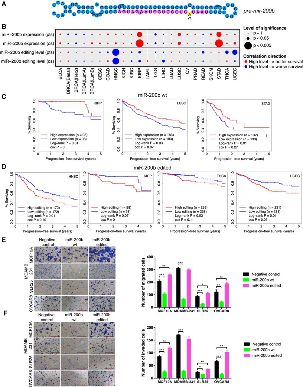 Effects of RNA editing in miR-200b on cell migration and invasion, and correlation with clinical outcomes. (A) Cartoon of A-to-I editing in stem–loop structure of pre-mir-200b. (B) Summary of correlations of WT miR-200b expression and miR-200 editing level with patient survival times across cancer types. Circle size represents statistical significance; color represents direction. In general, high expression of miR-200b is associated with better patient survival; high editing level in miR-200b is associated with worse patient survival. (C) Kaplan-Meier plots of patients grouped by miR-200b expression in individual cancer types. (D) Kaplan-Meier plots of patients grouped by editing level in miR-200b in individual cancer types. (E,F) Effects of miR-200b mimics on (E) migration and (F) invasion in MCF10A, MDAMB-231, SLR25, and OVCAR8 cells (n = 2 or 3). Two-sided t-test was used to assess the difference. Error bars denote ±SEM; (*) P < 0.05, (**) P < 0.01, (***) P < 0.001. Scale bar length is 500 µm.