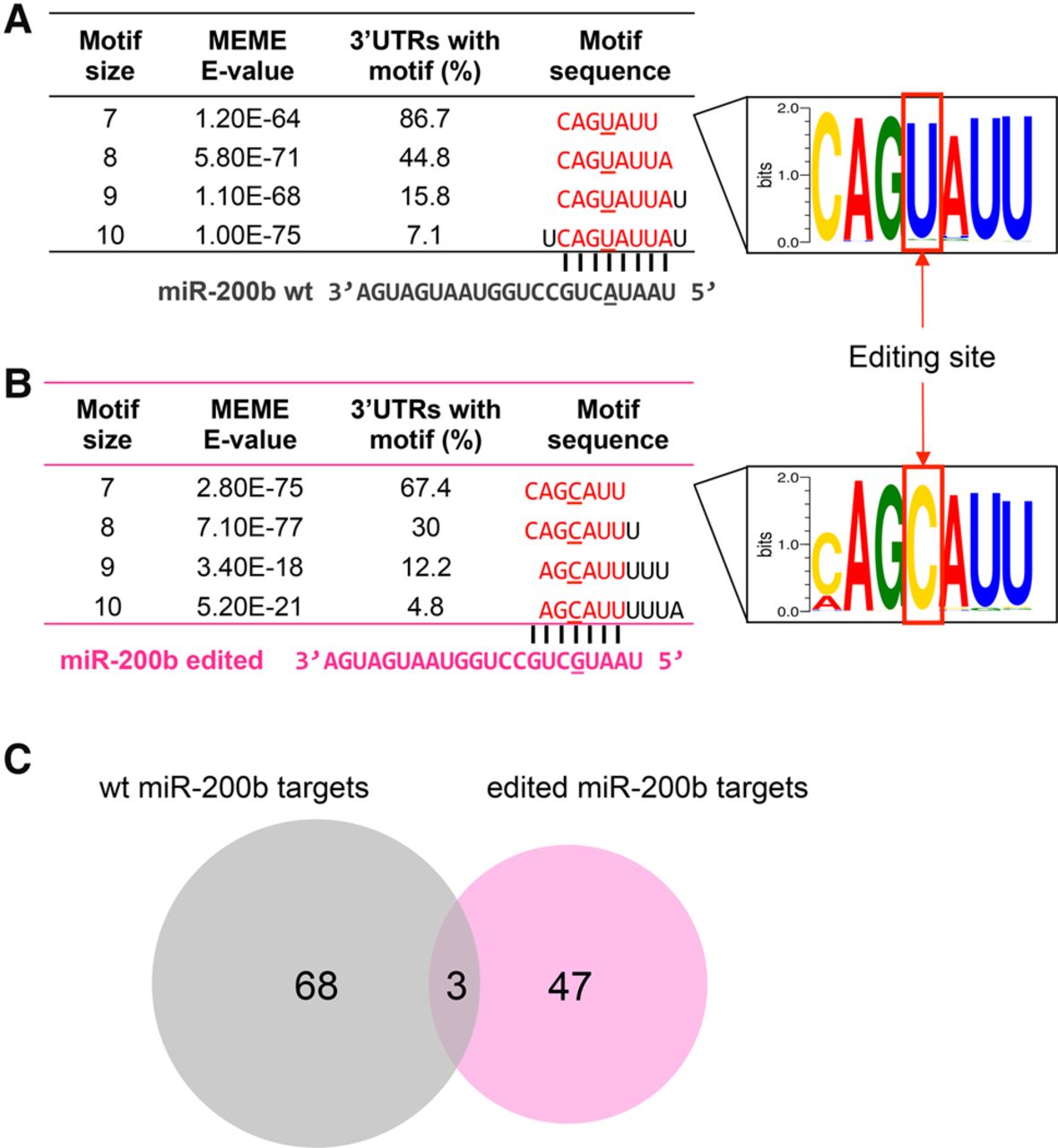 RNA editing in miR-200b redirects the target genes. (A) Sequence motif identified in 3′ UTRs of down-regulated genes upon transfection with WT miR-200b mimics (vs. negative control), corresponding to seed match of WT miR-200b. (B) Sequence motif identified in 3′ UTRs of down-regulated genes upon transfection with edited miR-200b mimics (vs. negative control), corresponding to seed match of edited miR-200b. (C) High-confidence predicted target genes of WT miR-200b and edited miR-200b by integrating gene expression and sequence motif data.