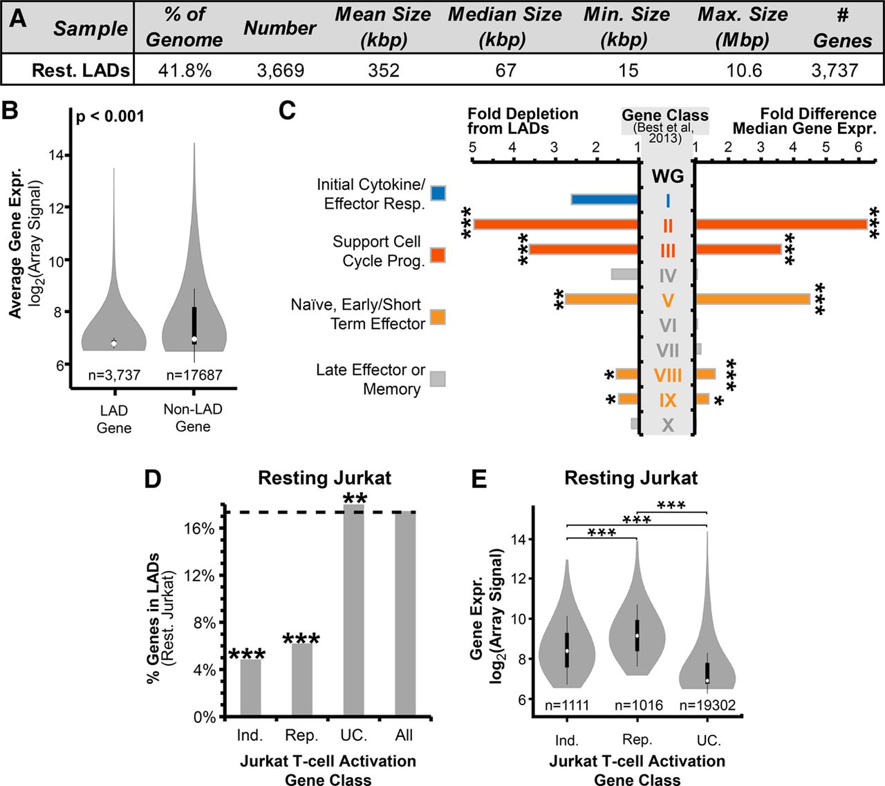Frequency of lamina association relates to gene expression and function. (A) Summary of resting Jurkat T-cell LAD parameters. (B) Violin plot comparing the microarray-determined signal between genes within LADs and non-LADs. (C) Fold differences in gene expression and frequency of lamina association in resting Jurkat T cells for 10 published categories of genes displaying distinct transcriptional behaviors during T-cell activation (Supplemental Fig. S2; Best et al. 2013). Fold differences were calculated relative to the whole genome (WG) in resting Jurkat T cells. Higher expressed genes tend to be depleted from LADs, such as categories associated with naïve cells, early effector function, and cell division. Lamina association correlated more with late effector/memory functional classes. (D) Percentage of genes in resting Jurkat LADs from different expression categories: genes induced (Ind.) or repressed (Rep.) at least 1.4-fold during T-cell activation, unchanged genes (UC.), and all genes. Both induced and repressed genes are three to four times less frequently found in LADs compared with unchanging genes. (E) Violin plot for expression levels of induced, repressed, and unchanging genes. Both induced and repressed categories are higher expressed than the unchanging genes in resting Jurkat T cells. (B,C,E) Significance of differential gene expression was determined by a Dunn test following a significant Kruskal-Wallis test. (C,D) Lamina-association frequency statistical significance was determined by Fisher's exact tests. (*) P < 0.05; (**) P < 0.01; (***) P < 0.001. See also Supplemental Figures S2 and S3 and Supplemental Table S1.