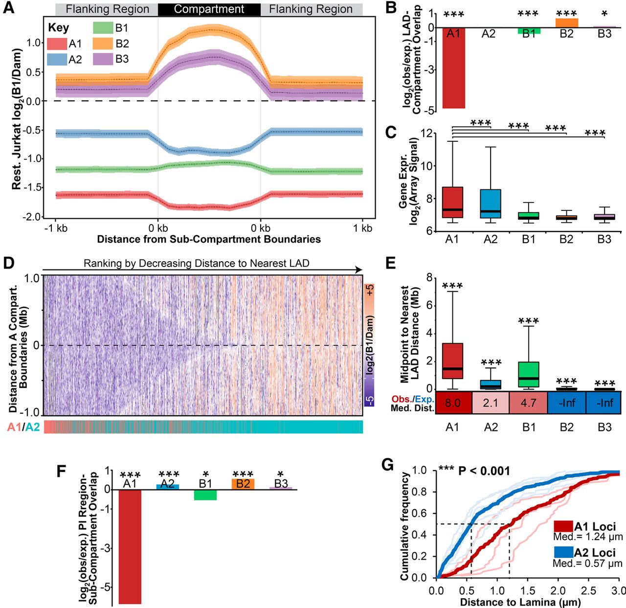 Compartments are distributed nonrandomly with respect to LADs. (A) Plot displaying the average log2(Lamin B1/Dam-only) signal from resting Jurkat T cells across all size-normalized A1, A2, B1, B2, or B3 GM12878 subcompartment regions and 1 kbp of flanking DNA. Compartment data from Rao et al. (2014). (B) Fold enrichment analysis of LADs observed (obs) in each compartment compared with that expected in a genome with randomly shuffled LADs (exp). (C) Box plot displaying the expression distribution in resting Jurkat T cells for each GM12878 subcompartment. (D) Heatmap of DamID log2(laminB1/Dam) signal across ±1 Mbp surrounding A subcompartment boundaries. Regions are ranked to the right by decreasing distance to nearest LADs, and their identity as an A1 or A2 subcompartment region is highlighted below in red or blue, respectively. A2 domains are observed more frequently closer to LADs than are A1. (E) Box plot displaying the distribution of chromosomal distances between the midpoint of subcompartment regions and the nearest LAD in resting Jurkat T cells. Below is the ratio between observed (Obs.) median distance and that expected (Exp.) in a randomly LAD-shuffled genome. Values are color-coded to show increased (red) or decreased (blue) observed distance compared with that expected. (F) Fold enrichment analysis of PI regions observed in each compartment compared with that expected in a genome with randomly shuffled PI regions. (G) Quantification of average distance between A1 (thick red line) or A2 loci (thick blue line) and the lamina determined by FISH for activated Jurkat T cells where PI loci are detached from the lamina. Lighter lines designate individual A2 (GBP, NFKBIZ, CBLB, CD200, BTLA) and A1 (IL2RA, CCND2, TNF) loci. Distance measurements were performed on a minimum of 50 nuclei per sample. (B,F) Significance was determined by Fisher's exact tests; (C,E) significance was by Dunn test for multiple comparison testing after a significant Kruskal-Wallis test. (G) Significance of the difference between A1 and A2 distances to lamina was determined by KS tests. (*) P < 0.05; (***) P < 0.001. See also Supplemental Figure S6.