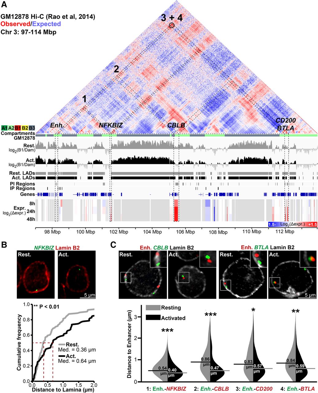 Genes released from LADs during T-cell activation associate in the interior in activated Jurkat T cells. (A) Genomic view of a 17-Mbp region of Chromosome 3 displaying GM12878 cell Hi-C interactions from published contact maps (Rao et al. 2014). Hi-C data are displayed as a heatmap of the ratio of observed versus expected contact frequencies in a distance-scaled model. GM12878 subcompartments (A1, A2, B1, B2, B3) are color-coded directly beneath the map. Tracks are displayed as in previous figures. The black circle represents a highly significant DNA–DNA contact detected by Rao et al. (2014). Several genes—NFKBIZ, CBLB, CD200, and BTLA—and a T-cell activation–specific enhancer (Enh.) display reduced lamina association during T-cell activation concomitant with transcriptional induction and are present in the GM12878 A2 subcompartment. (B) Representative micrographs and quantification NFKBIZ loci positions in resting and activated cells relative to Lamin B2. (C) Representative micrographs and violin plot quantification of distances between the enhancer and indicated genes in resting and activated Jurkat T cells. All enhancer-gene FISH probe combinations display reduced inter-probe distance following activation. For quantification statistics, relative distance measurements between loci or between loci and Lamin B2 were compared between the activated and resting cells by KS tests. (*) P < 0.05; (**) P < 0.01; (***) P < 0.001. Distance measurements were performed on a minimum of 50 nuclei per sample. See also Supplemental Figure S7.