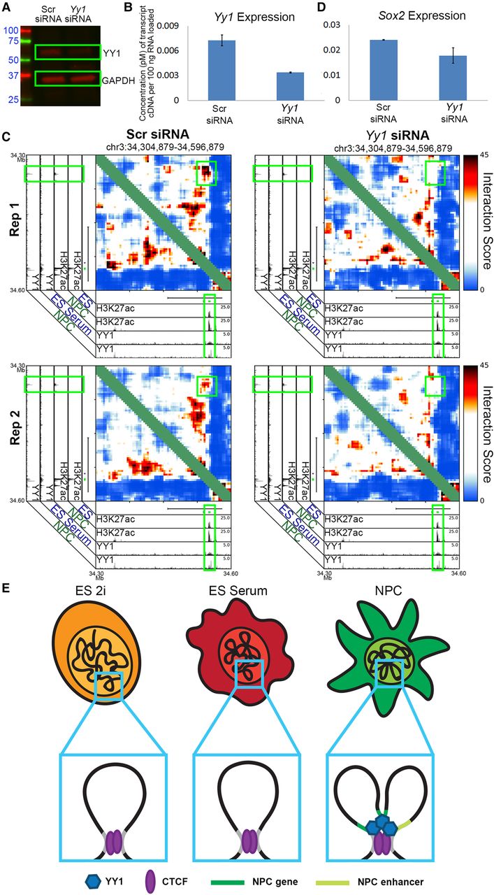 YY1-mediated developmentally regulated looping interactions form within a constitutive framework demarcated by CTCF. (A) Western blot analysis querying YY1 and GAPDH protein levels in NPCs exposed to nontargeting control and Yy1-targeting siRNA. (B) Gene-expression quantified by qPCR of the Yy1 gene in NPCs exposed to control and Yy1-targeting siRNA. (C) Zoom-in interaction score heatmaps of a loop between the Sox2 gene and an upstream enhancer (originally presented in Fig. 3K) in NPCs exposed to nontargeting control siRNA (left) and an siRNA targeting Yy1 (right). (D) Gene-expression quantified by qPCR of the Sox2 gene in NPCs exposed to control and Yy1-targeting siRNA. (E) Schematic depicting a CTCF-mediated constitutive interaction, present across all early stages of neural lineage commitment, and a YY1-mediated gene-enhancer interaction, present only in NPCs.