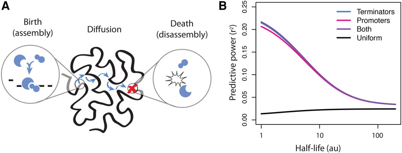 The birth-diffusion-death model of position effects. (A) Sketch of the model. Rate-limiting complexes for expression are released from DNA at assembly sites and diffuse on chromatin until they dissociate. At each step of the diffusion process, the complexes “jump” to another site on the genome with a probability that is proportional to the value of the Hi-C contact matrix. (B) Models with unstable complexes better fit the expression of the reporters. The best model corresponds to release sites at both promoters and terminators, but it is only marginally better than assuming that complexes are released at terminators only. The black curve represents the predictive power of a null model where assembly sites have a uniform distribution. The half-life is measured in number of “jumps.”