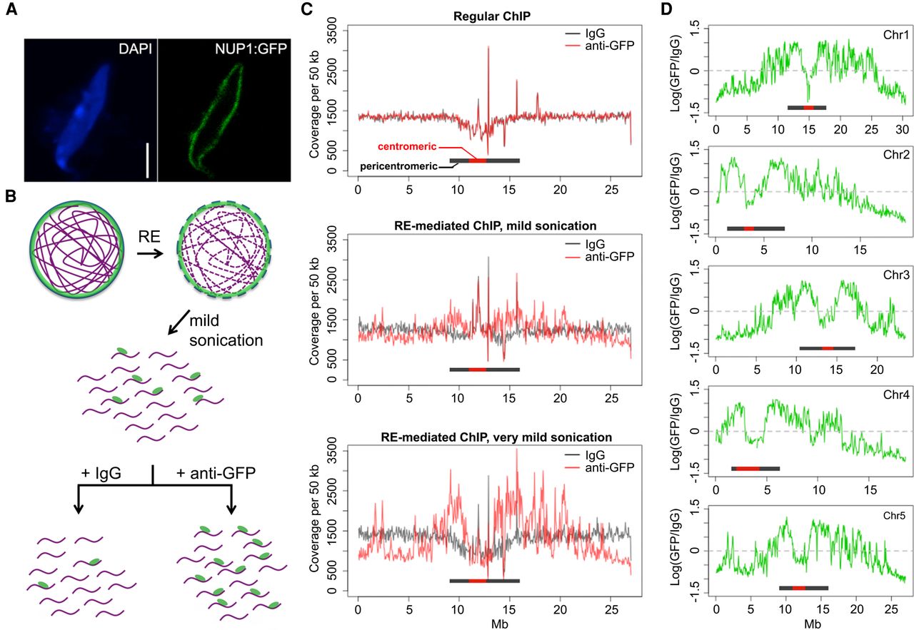 Identification of chromatin located at the nuclear periphery by RE-ChIP. (A) Localization of the NUP1:GFP protein in an Arabidopsis nucleus: (scale bar) 2 µm. (B) Procedures for RE-mediated ChIP with NUP1:GFP (green). Chromatin (purple lines) fragmentation and isolation are conducted with a combination of RE (restriction enzyme) digestion and mild sonication. (C) Normalized sequence coverage (50-kb window size) on Chromosome 5 from various ChIP experiments. The horizontal bars depict pericentromeric regions, within which centromeric regions are highlighted in red. (D) NUP1:GFP RE-mediated ChIP-seq signal (50-kb window size), represented as the log2 value of the ratio between normalized anti-GFP and IgG coverage, over all five chromosomes. Horizontal bars indicate the centromeric/pericentromeric regions, as in C.