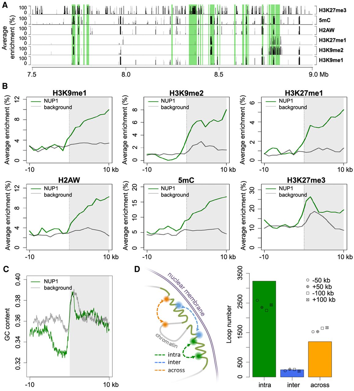 Epigenetic, genomic, and structural features of chromatin tethered at the nuclear periphery. (A) A representative genomic region from Chromosome 1 showing the distributions of NUP1-enriched chromatin identified from 7-d-old leaf tissues (shaded in green) and various epigenetic marks. Average enrichment means the percentage of regions (calculated from 100-bp windows) enriched for the respective epigenetic mark. (B,C) Epigenetic marks (B) and GC content (C) around NUP1-enriched domain borders, shown as a vertical line separating the white and gray blocks. For each plot, the area on the right indicates NUP1-enriched domains (although not all are larger than 10 kb). Average enrichment in B is defined as in A. The GC content in C is in a window size of 100 bp, with a step size of 20 bp. Because enrichment of gene bodies is found inward from NUP1-enriched domain boundaries (see Supplemental Fig. 12), for the background, we randomly picked 3000 genes with the same expression distribution profile as that of NUP1-enriched genes. For these control genes, we extracted the 20-kb regions flanking either their transcription start sites or their transcription termination sites, which were selected randomly. (D) Different types of chromatin loops associated with NUP1-enriched domains (including those in pericentromeric regions). Chromatin loops are from Liu et al. (2016). For both “intra” and “across,” the number of observed chromatin loops are significantly different (P < 2.2 × 10−16) relative to the permutation-based null distribution of the background, which was simulated by shifting the coordinates of NUP1-enriched domains ±50 kb or ±100 kb.