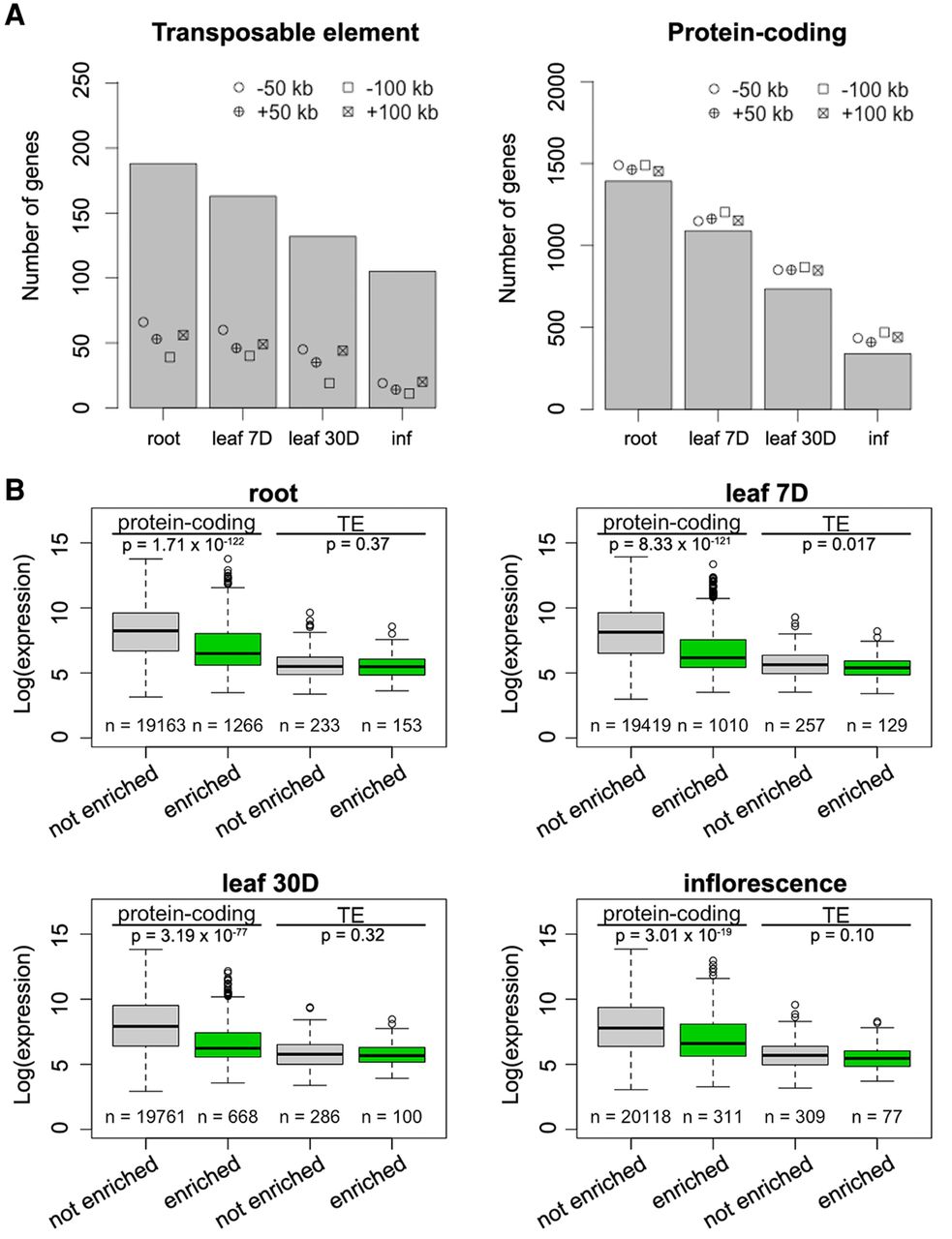 Enrichment of silenced genes at the nuclear periphery. (A) Number of TE genes (left) and protein-coding genes (right) enriched in different tissues. For each column, the observed number of genes is significantly different (P < 0.001) relative to the permutation-based null distribution of the background (generated as described in Fig. 4C): (inf) inflorescence. (B) Comparison of gene expression levels, which are from a normalized tilling array data set (Laubinger et al. 2008). The P-values indicate Mann-Whitney U test results.