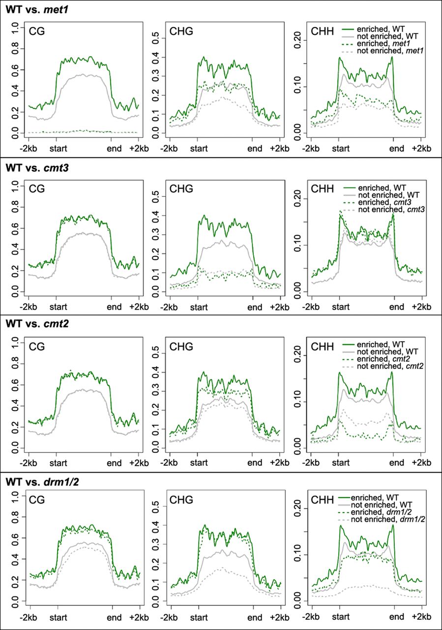 Comparison of DNA methylation over TEs. Patterns of TE DNA methylation (CpG, CHG, CHH) in wild-type (WT) and mutants. The grouping of TEs is according to the enrichment results of NUP1:GFP RE-ChIP-seq from 30-d-old leaf tissues. The methylation ratio is calculated in 100-bp windows. The signal over each TE is linearly transformed so that the boundaries of all TEs are aligned.