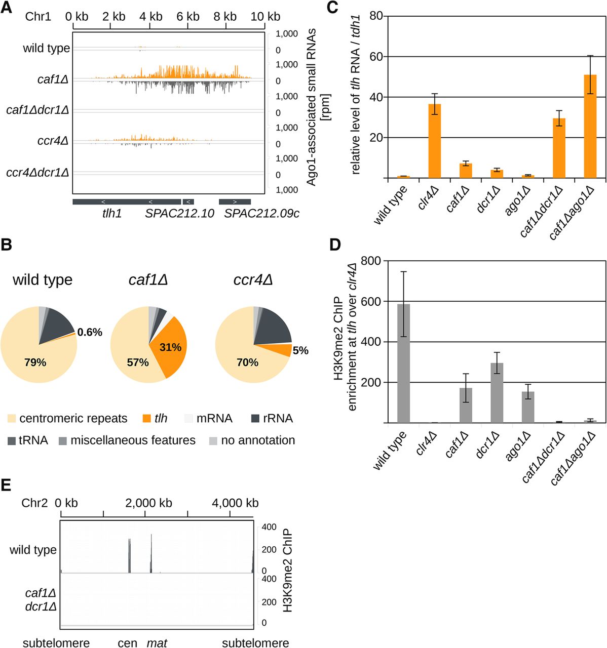 Caf1 and RNAi are required for heterochromatin formation at transcribed regions. (A) Endogenously tagged Argonaute-bound small RNA reads in the indicated cells were plotted over the subtelomeric region. The location of genes is indicated as gray boxes below the small RNA peaks. Reads from + and − strands are depicted in orange and gray, respectively. Scale bars on the right denote small RNA read numbers normalized per one million reads. tlh is present at subtelomeres of both arms of Chromosomes 1 and 2 (Mandell et al. 2005; Hansen et al. 2006). (B) Classification of Argonaute-bound small RNAs from wild-type, caf1Δ, and ccr4Δ cells. Pie charts illustrate percentages for the individual small RNA classes relative to the total number of reads for each strain. Argonaute-bound subtelomeric siRNAs are increased by more than 50-fold in caf1Δ cells compared with the wild type. (C) Quantification of subtelomeric tlh transcripts in indicated strains by RT-qPCR. In caf1Δdcr1Δ and caf1Δago1Δ cells, silencing of subtelomeric repeats is lost. Error bars, SE of more than seven independent experiments. For caf1Δdcr1Δ and caf1Δago1Δ, experiments of two independent colonies were averaged, respectively. Reverse transcription was performed with specific primers; the wild type was set to one. (D) ChIP experiment showing that H3K9me2 is lost at subtelomeric tlh repeats in caf1Δdcr1Δ cells. Error bars, SE of at least four independent experiments. For caf1Δdcr1Δ and caf1Δago1Δ, data of two independent colonies were averaged, respectively. clr4Δ was set to one. (E) ChIP-seq showing that H3K9me2 is lost at all constitutive heterochromatic loci in caf1Δdcr1Δ cells. Scale bars on the right denote read numbers per million reads normalized to the TAS region (Chr 2: 4534 kb–4538 kb) where H3K9me2 is not lost in the mutant.