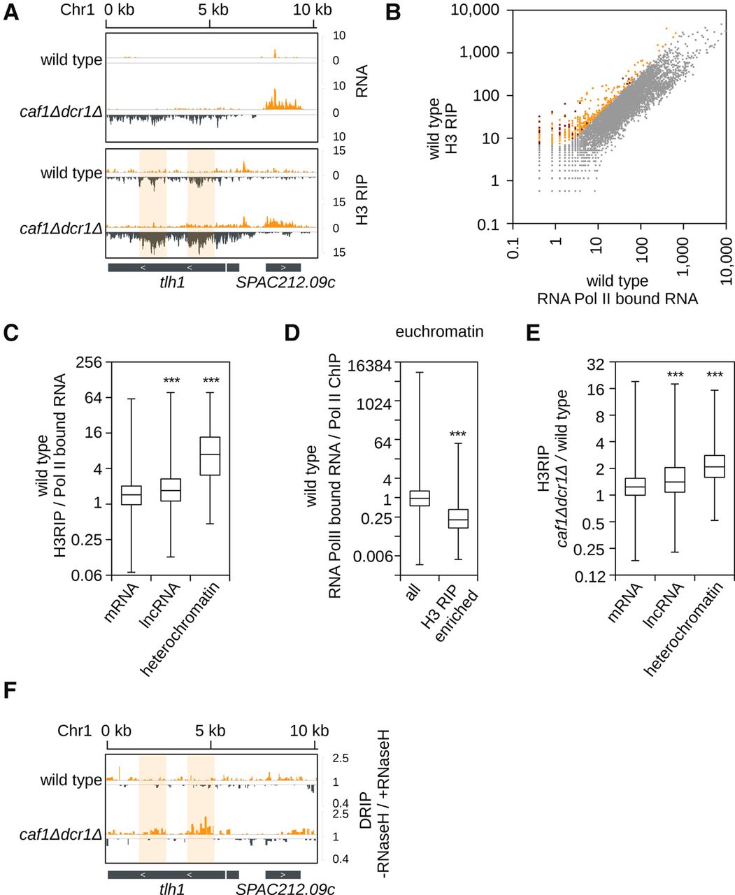 Heterochromatic transcripts accumulate on chromatin. (A) H3-RIP sequencing reads in indicated cells are plotted over the subtelomeric region. Total RNA sequencing reads on top as control. Reads from + and − strands are depicted in orange and gray, respectively. Scale bars on the right denote RNA read numbers per total number of reads mapping to protein coding genes. Compared with total RNA, tlh is enriched at the chromatin in wild-type and caf1Δdcr1Δ cells. Region where DNA:RNA hybrids are enriched is highlighted. Scale bars on the right denote RNA read numbers normalized to total number of reads mapping to protein coding genes. (B) Scatter plot showing H3-associated RNA relative to RNA Pol II–bound nascent RNA. A subset of genes is more enriched in H3 RIP than bound to RNA Pol II, indicating post-transcriptional retention on chromatin. Lowly expressed genes show stronger enrichment on chromatin. RNAs enriched on chromatin are shown in orange or red for heterochromatic RNA. (C) Box plot analysis of H3-associated RNA relative to nascent RNA bound to RNA Pol II in wild-type cells. (lncRNA) Euchromatic noncoding RNA with annotation SPNCRNA, n = 1354; (mRNA) all protein coding genes without genes in heterochromatic areas, n = 5014; (heterochromatic) genes which are located in constitutive heterochromatin areas, n = 62. Relative to their transcript levels, ncRNAs and especially heterochromatic RNA are more likely to be bound to chromatin than mRNA. (***) P < 0.001. (D) Box plot analysis of nascent RNA bound to RNA Pol II relative to RNA Pol II ChIP in wild-type cells. Genes that have RNA enriched on chromatin show reduced transcription compared with the quantity of RNA Pol II on the chromatin. (all) All mRNA and lncRNA, n = 6345; (chromatin enriched) euchromatic genes (mRNA and lncRNA) with greater than fourfold enrichment in H3-RIP over nascent RNA, n = 258. (***) P < 0.001. (E) Box plot analysis of H3-associated RNA in caf1Δdcr1Δ cells relative to wild-type cells. In caf1Δdcr1Δ cells, heterochromatic RNA and lncRNA are even more associated with chromatin than in wild-type cells. (mRNA) n = 5058; (lncRNA) n = 1467; (heterochromatin) n = 90. (***) P < 0.001. (F) DNA:RNA hybrid sequencing in wild-type and caf1Δdcr1Δ cells plotted over the subtelomeric region. DNA:RNA hybrids are formed with same sequences, which are also enriched in H3-RIP (highlighted). Scale bars on the right denote the ratio of “sample not treated” over “sample treated” with RNase H (−RNase H/+RNase H) before immunoprecipitation.